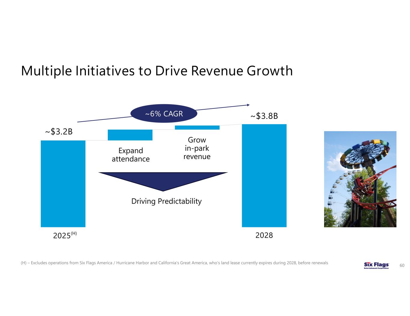 ~$3.2B ~$3.8B Expand attendance Grow in-park revenue ~6% CAGR 2025(H) 2028 Multiple Initiatives to Drive Revenue Growth 60 Driving Predictability (H) – Excludes operations from Six Flags America / Hurricane Harbor and California’s Great America, who’s land lease currently expires during 2028, before renewals