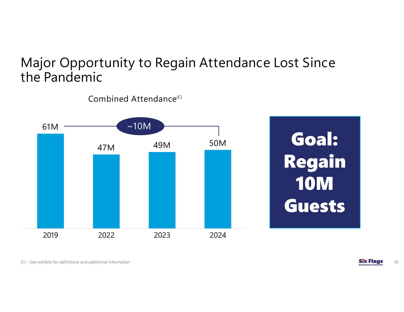 Major Opportunity to Regain Attendance Lost Since the Pandemic 61 61M 47M 49M 50M 2019 2022 2023 2024 Combined Attendance(C) ~10M Goal: Regain 10M Guests (C) – See exhibits for definitions and additional information