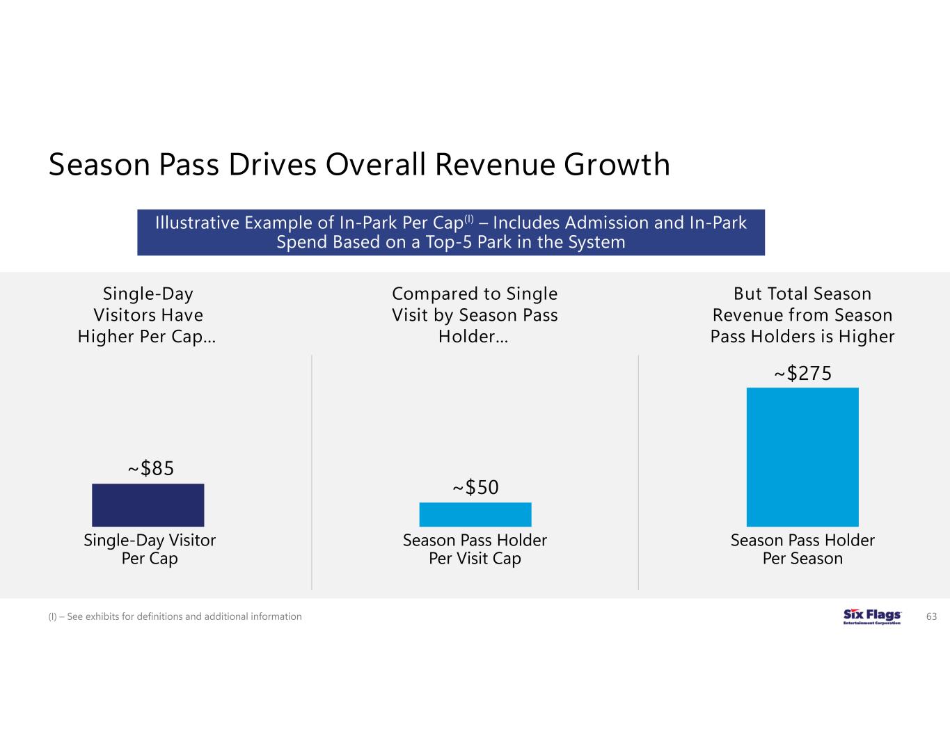 Season Pass Drives Overall Revenue Growth 63 Illustrative Example of In-Park Per Cap(I) – Includes Admission and In-Park Spend Based on a Top-5 Park in the System ~$85 ~$50 ~$275 Single-Day Visitor Per Cap Season Pass Holder Per Visit Cap Single-Day Visitors Have Higher Per Cap… Compared to Single Visit by Season Pass Holder… But Total Season Revenue from Season Pass Holders is Higher Season Pass Holder Per Season (I) – See exhibits for definitions and additional information