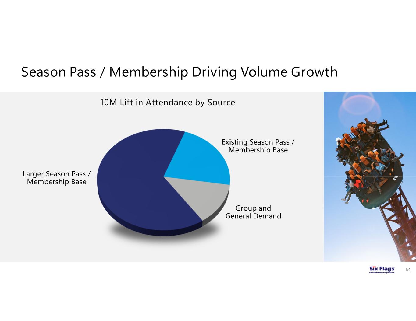 Season Pass / Membership Driving Volume Growth 64 10M Lift in Attendance by Source Group and General Demand Existing Season Pass / Membership Base Larger Season Pass / Membership Base