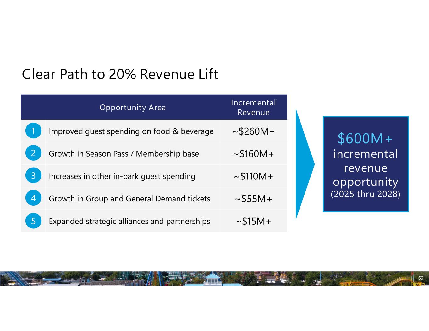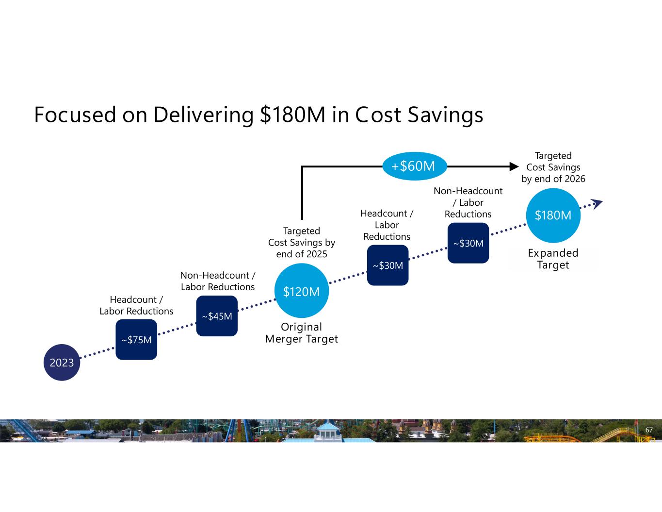 Clear Path to 20% Revenue Lift 66 Incremental Revenue Opportunity Area ~$260M+ Improved guest spending on food & beverage ~$160M+ Growth in Season Pass / Membership base ~$110M+ Increases in other in-park guest spending ~$55M+ Growth in Group and General Demand tickets ~$15M+ Expanded strategic alliances and partnerships 1 2 3 4 5 $600M+ incremental revenue opportunity (2025 thru 2028)