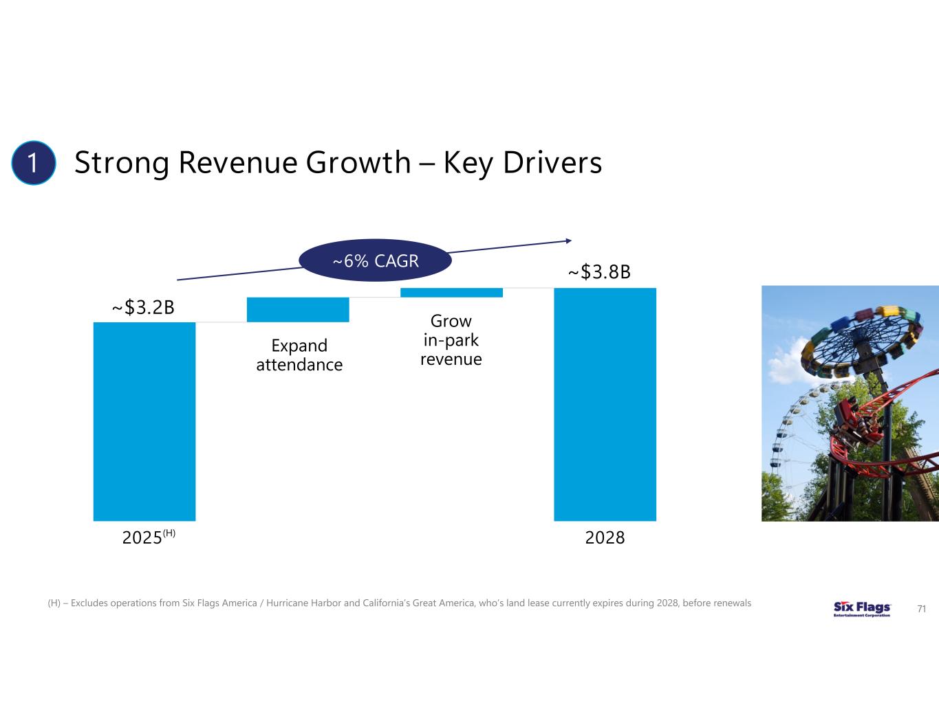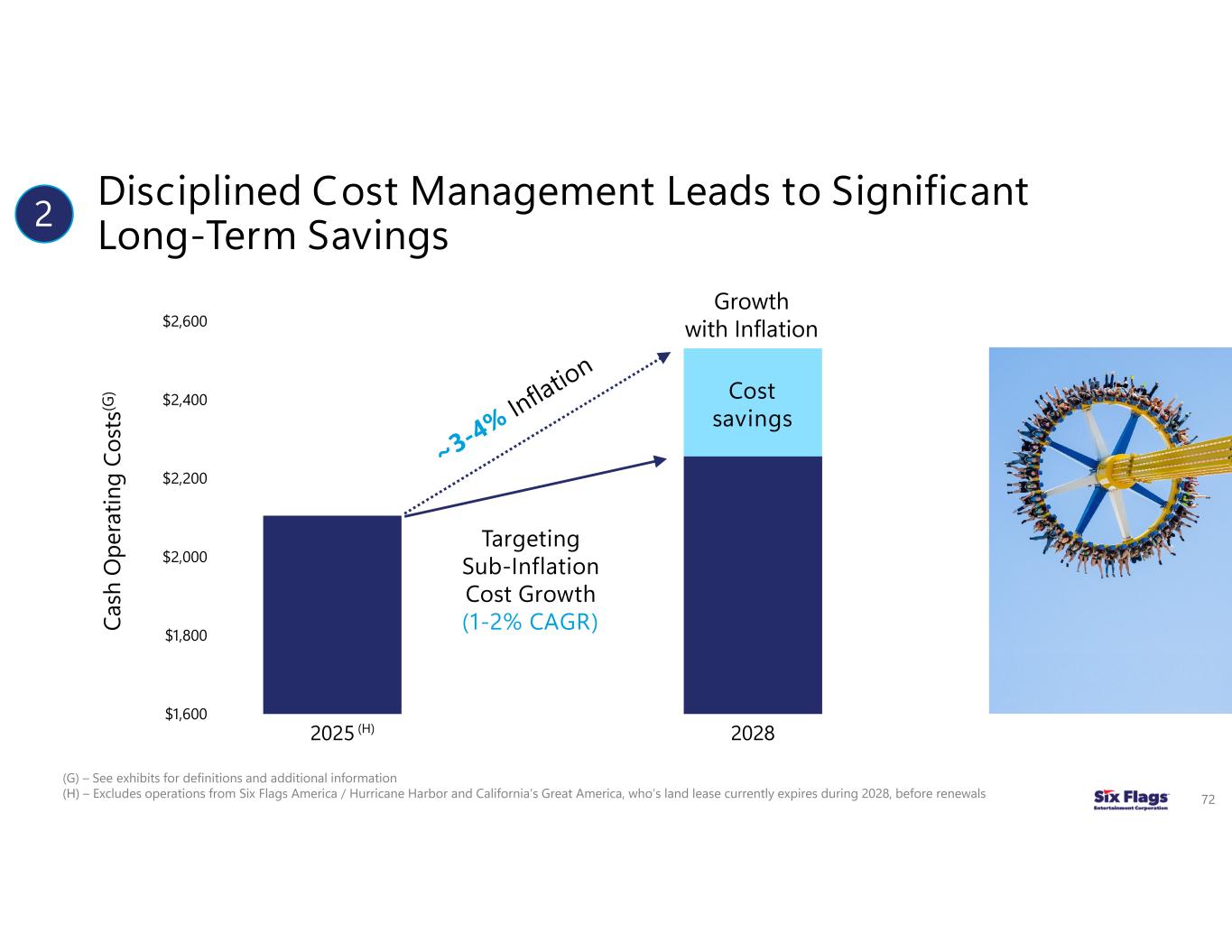 ~$3.2B ~$3.8B Expand attendance Grow in-park revenue ~6% CAGR 2025(H) 2028 Strong Revenue Growth – Key Drivers 71 1 (H) – Excludes operations from Six Flags America / Hurricane Harbor and California’s Great America, who’s land lease currently expires during 2028, before renewals