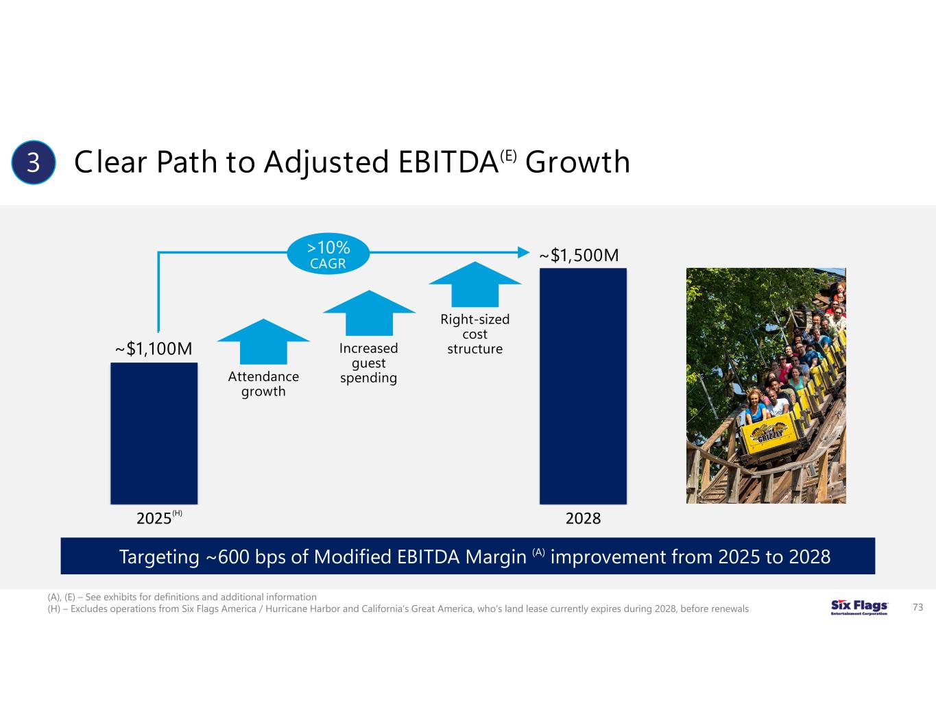 Disciplined Cost Management Leads to Significant Long-Term Savings (G) – See exhibits for definitions and additional information (H) – Excludes operations from Six Flags America / Hurricane Harbor and California’s Great America, who’s land lease currently expires during 2028, before renewals 72 $1,600 $1,800 $2,000 $2,200 $2,400 $2,600 2025 2028 Targeting Sub-Inflation Cost Growth (1-2% CAGR) Growth with Inflation Cost savings (H) Ca sh O pe ra tin g Co st s(G ) 2