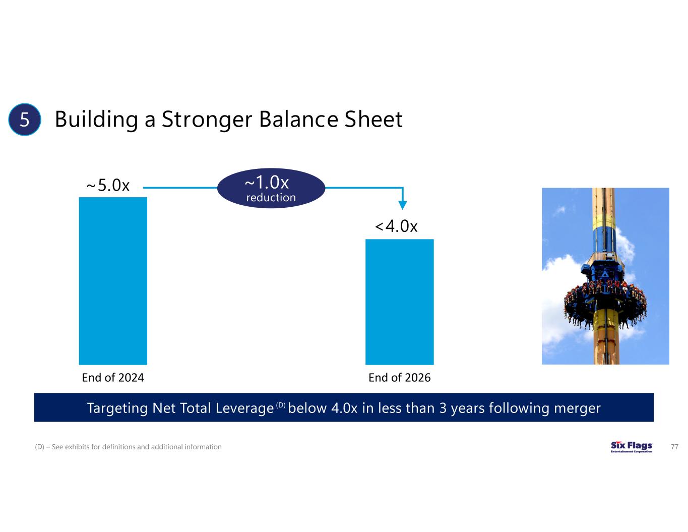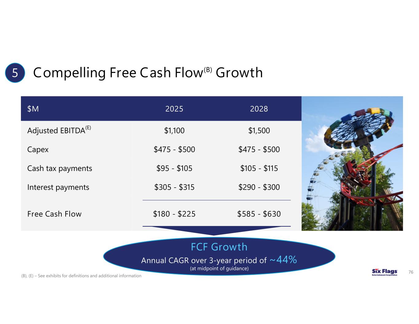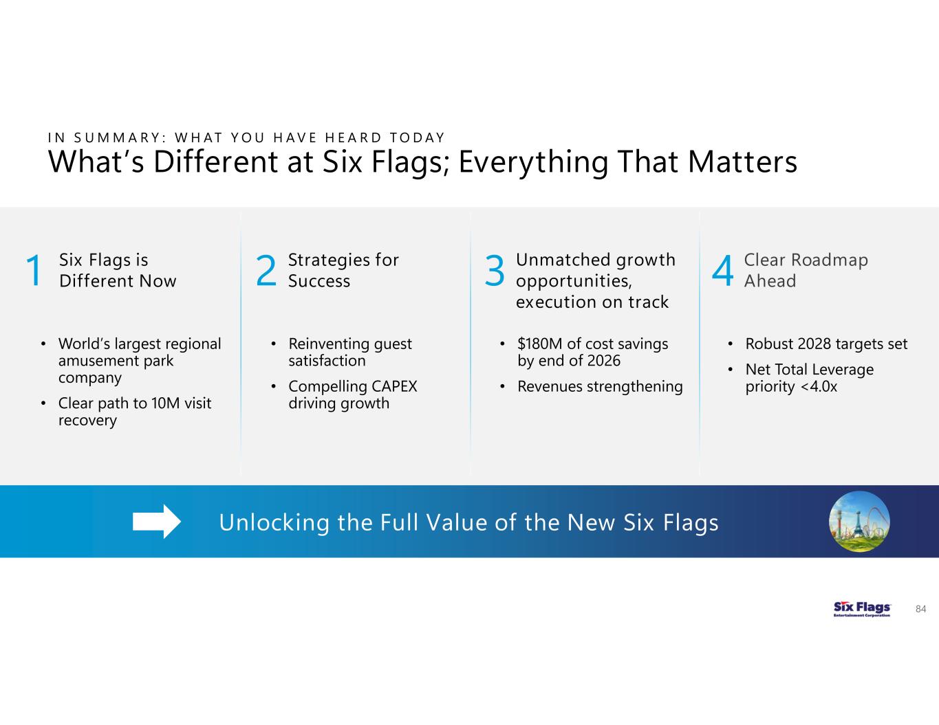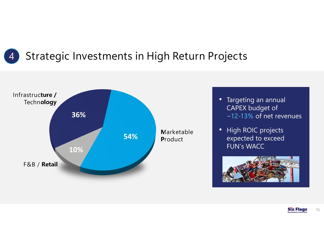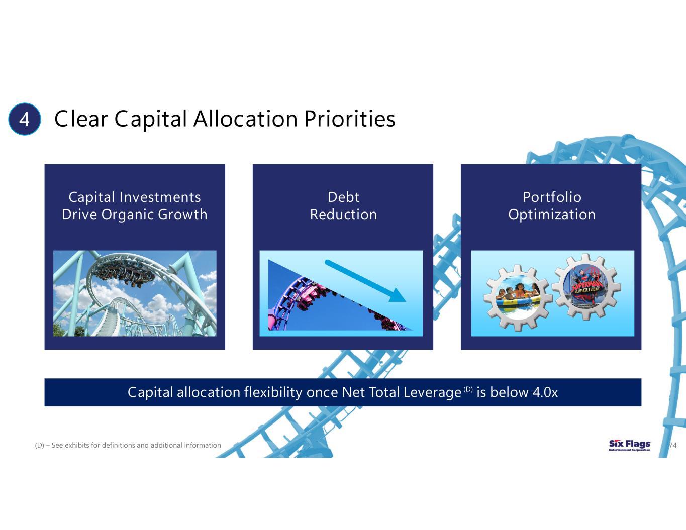 Clear Path to Adjusted EBITDA(E) Growth 73 2025 2028 ~$1,500M ~$1,100M Targeting ~600 bps of Modified EBITDA Margin (A) improvement from 2025 to 2028 Attendance growth Right-sized cost structure Increased guest spending >10% CAGR (H) (A), (E) – See exhibits for definitions and additional information (H) – Excludes operations from Six Flags America / Hurricane Harbor and California’s Great America, who’s land lease currently expires during 2028, before renewals 3