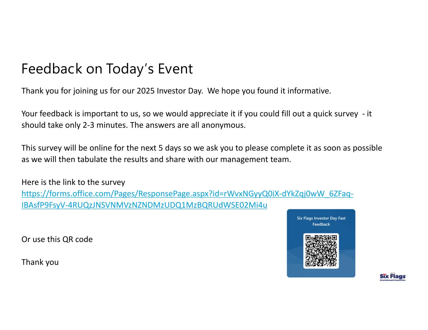 Thank you for joining us for our 2025 Investor Day. We hope you found it informative. Your feedback is important to us, so we would appreciate it if you could fill out a quick survey - it should take only 2-3 minutes. The answers are all anonymous. This survey will be online for the next 5 days so we ask you to please complete it as soon as possible as we will then tabulate the results and share with our management team. Here is the link to the survey https://forms.office.com/Pages/ResponsePage.aspx?id=rWvxNGyyQ0iX-dYkZqj0wW_6ZFaq- IBAsfP9FsyV-4RUQzJNSVNMVzNZNDMzUDQ1MzBQRUdWSE02Mi4u Or use this QR code Thank you Feedback on Today’s Event 82