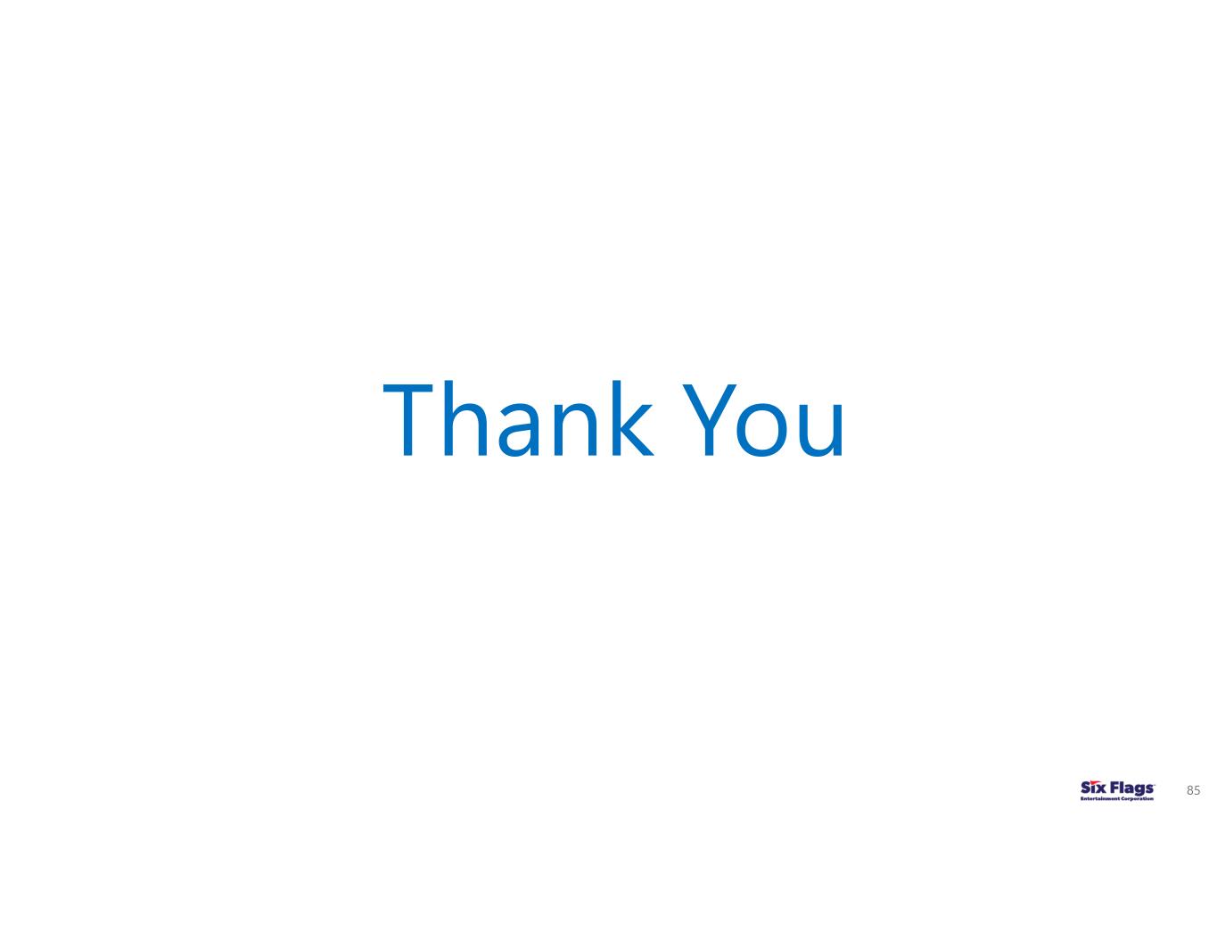 I N S U M M A R Y : W H A T Y O U H A V E H E A R D T O D A Y What’s Different at Six Flags; Everything That Matters 1 Six Flags is Different Now 2 Strategies for Success 3 Unmatched growth opportunities, execution on track 4 Clear Roadmap Ahead Unlocking the Full Value of the New Six Flags 84 • World’s largest regional amusement park company • Clear path to 10M visit recovery • Reinventing guest satisfaction • Compelling CAPEX driving growth • $180M of cost savings by end of 2026 • Revenues strengthening • Robust 2028 targets set • Net Total Leverage priority <4.0x
