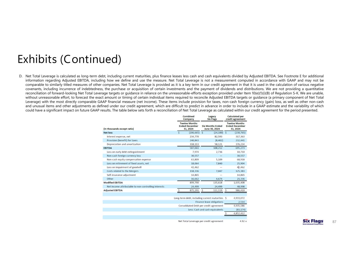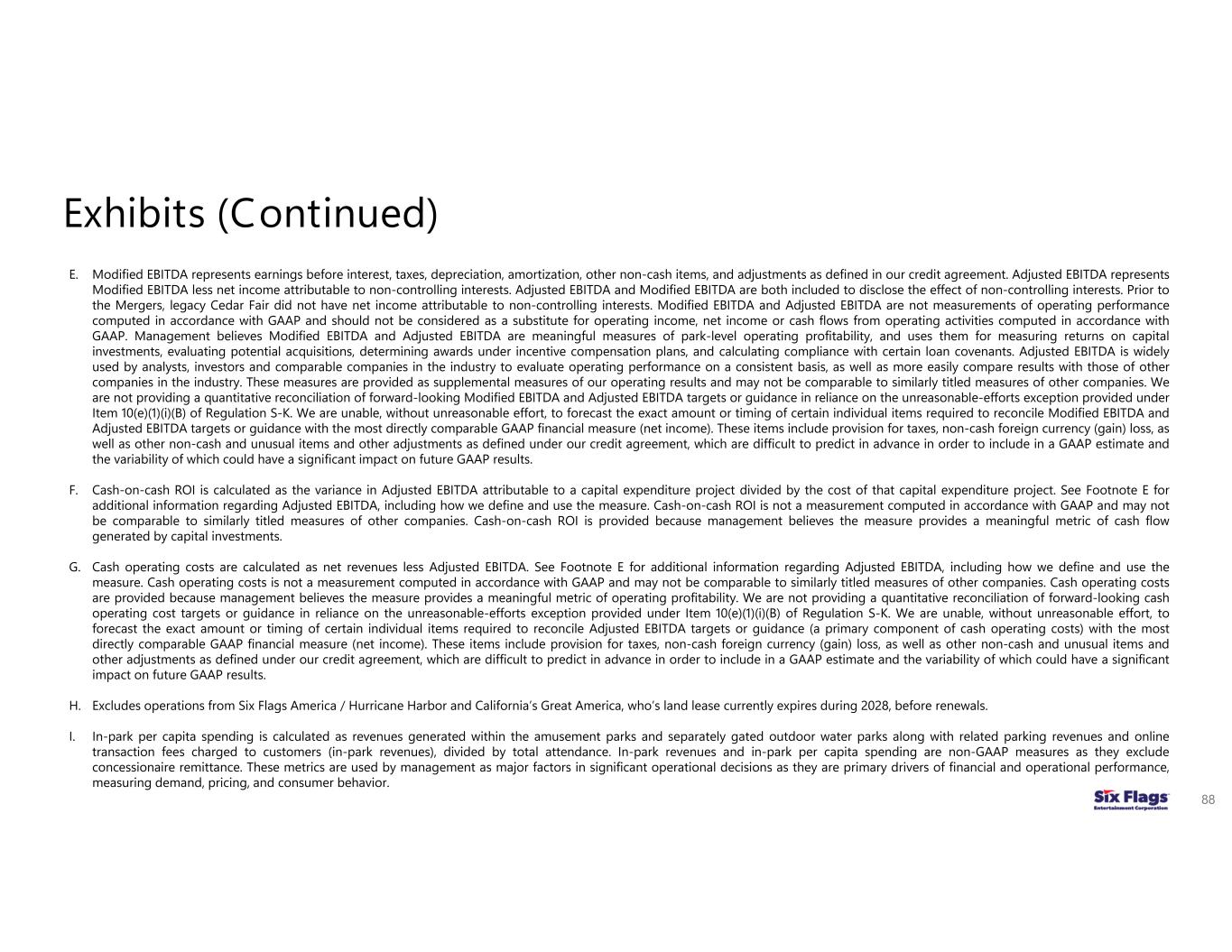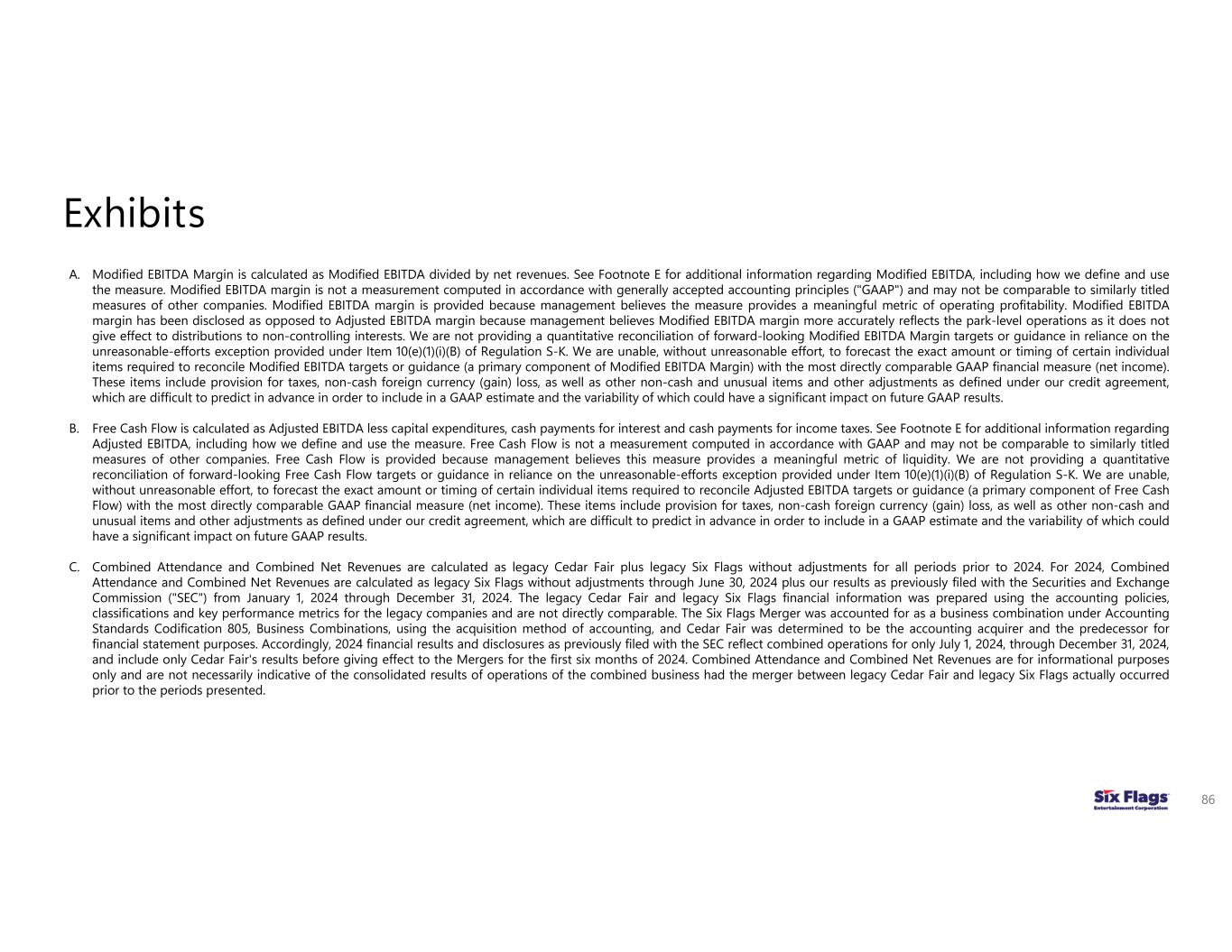 Exhibits 86 A. Modified EBITDA Margin is calculated as Modified EBITDA divided by net revenues. See Footnote E for additional information regarding Modified EBITDA, including how we define and use the measure. Modified EBITDA margin is not a measurement computed in accordance with generally accepted accounting principles ("GAAP") and may not be comparable to similarly titled measures of other companies. Modified EBITDA margin is provided because management believes the measure provides a meaningful metric of operating profitability. Modified EBITDA margin has been disclosed as opposed to Adjusted EBITDA margin because management believes Modified EBITDA margin more accurately reflects the park-level operations as it does not give effect to distributions to non-controlling interests. We are not providing a quantitative reconciliation of forward-looking Modified EBITDA Margin targets or guidance in reliance on the unreasonable-efforts exception provided under Item 10(e)(1)(i)(B) of Regulation S-K. We are unable, without unreasonable effort, to forecast the exact amount or timing of certain individual items required to reconcile Modified EBITDA targets or guidance (a primary component of Modified EBITDA Margin) with the most directly comparable GAAP financial measure (net income). These items include provision for taxes, non-cash foreign currency (gain) loss, as well as other non-cash and unusual items and other adjustments as defined under our credit agreement, which are difficult to predict in advance in order to include in a GAAP estimate and the variability of which could have a significant impact on future GAAP results. B. Free Cash Flow is calculated as Adjusted EBITDA less capital expenditures, cash payments for interest and cash payments for income taxes. See Footnote E for additional information regarding Adjusted EBITDA, including how we define and use the measure. Free Cash Flow is not a measurement computed in accordance with GAAP and may not be comparable to similarly titled measures of other companies. Free Cash Flow is provided because management believes this measure provides a meaningful metric of liquidity. We are not providing a quantitative reconciliation of forward-looking Free Cash Flow targets or guidance in reliance on the unreasonable-efforts exception provided under Item 10(e)(1)(i)(B) of Regulation S-K. We are unable, without unreasonable effort, to forecast the exact amount or timing of certain individual items required to reconcile Adjusted EBITDA targets or guidance (a primary component of Free Cash Flow) with the most directly comparable GAAP financial measure (net income). These items include provision for taxes, non-cash foreign currency (gain) loss, as well as other non-cash and unusual items and other adjustments as defined under our credit agreement, which are difficult to predict in advance in order to include in a GAAP estimate and the variability of which could have a significant impact on future GAAP results. C. Combined Attendance and Combined Net Revenues are calculated as legacy Cedar Fair plus legacy Six Flags without adjustments for all periods prior to 2024. For 2024, Combined Attendance and Combined Net Revenues are calculated as legacy Six Flags without adjustments through June 30, 2024 plus our results as previously filed with the Securities and Exchange Commission ("SEC") from January 1, 2024 through December 31, 2024. The legacy Cedar Fair and legacy Six Flags financial information was prepared using the accounting policies, classifications and key performance metrics for the legacy companies and are not directly comparable. The Six Flags Merger was accounted for as a business combination under Accounting Standards Codification 805, Business Combinations, using the acquisition method of accounting, and Cedar Fair was determined to be the accounting acquirer and the predecessor for financial statement purposes. Accordingly, 2024 financial results and disclosures as previously filed with the SEC reflect combined operations for only July 1, 2024, through December 31, 2024, and include only Cedar Fair's results before giving effect to the Mergers for the first six months of 2024. Combined Attendance and Combined Net Revenues are for informational purposes only and are not necessarily indicative of the consolidated results of operations of the combined business had the merger between legacy Cedar Fair and legacy Six Flags actually occurred prior to the periods presented.