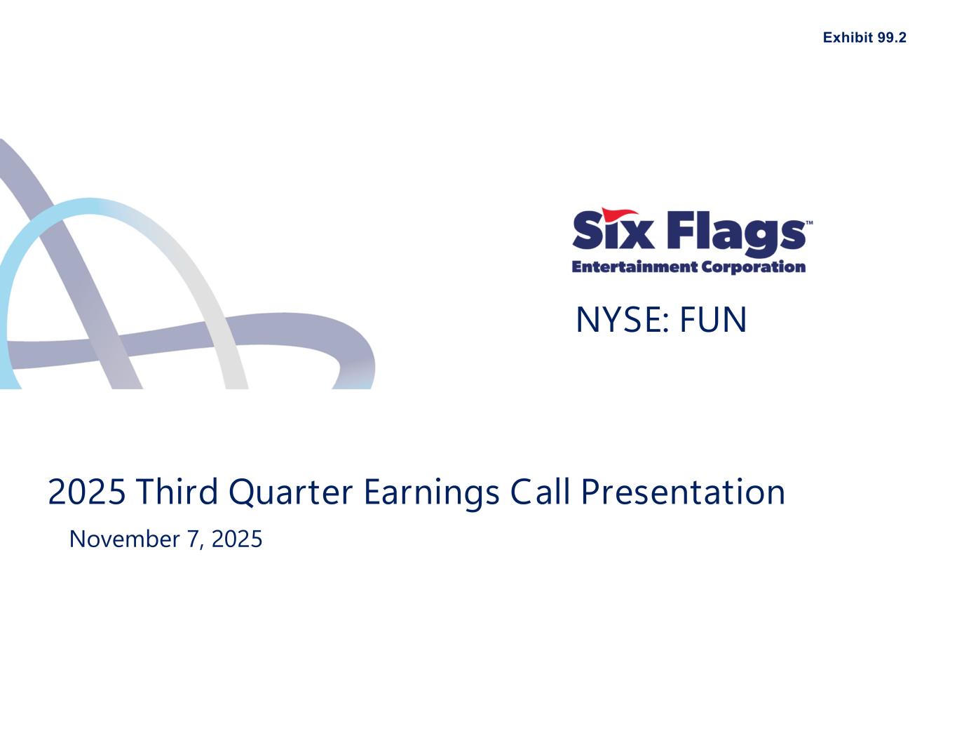 CHARLOTTE, N.C. (Nov. 7, 2025) -- Six Flags Entertainment Corporation (NYSE: FUN) (the “Company”, “Six Flags”, or the “Combined Company”), the largest regional amusement park operator in North America, today announced results for its 2025 third quarter ended Sept. 28, 2025. The Company is also providing a fourth quarter performance update through Nov. 2, 2025, and updating its previously provided full year Adjusted EBITDA(1) guidance.