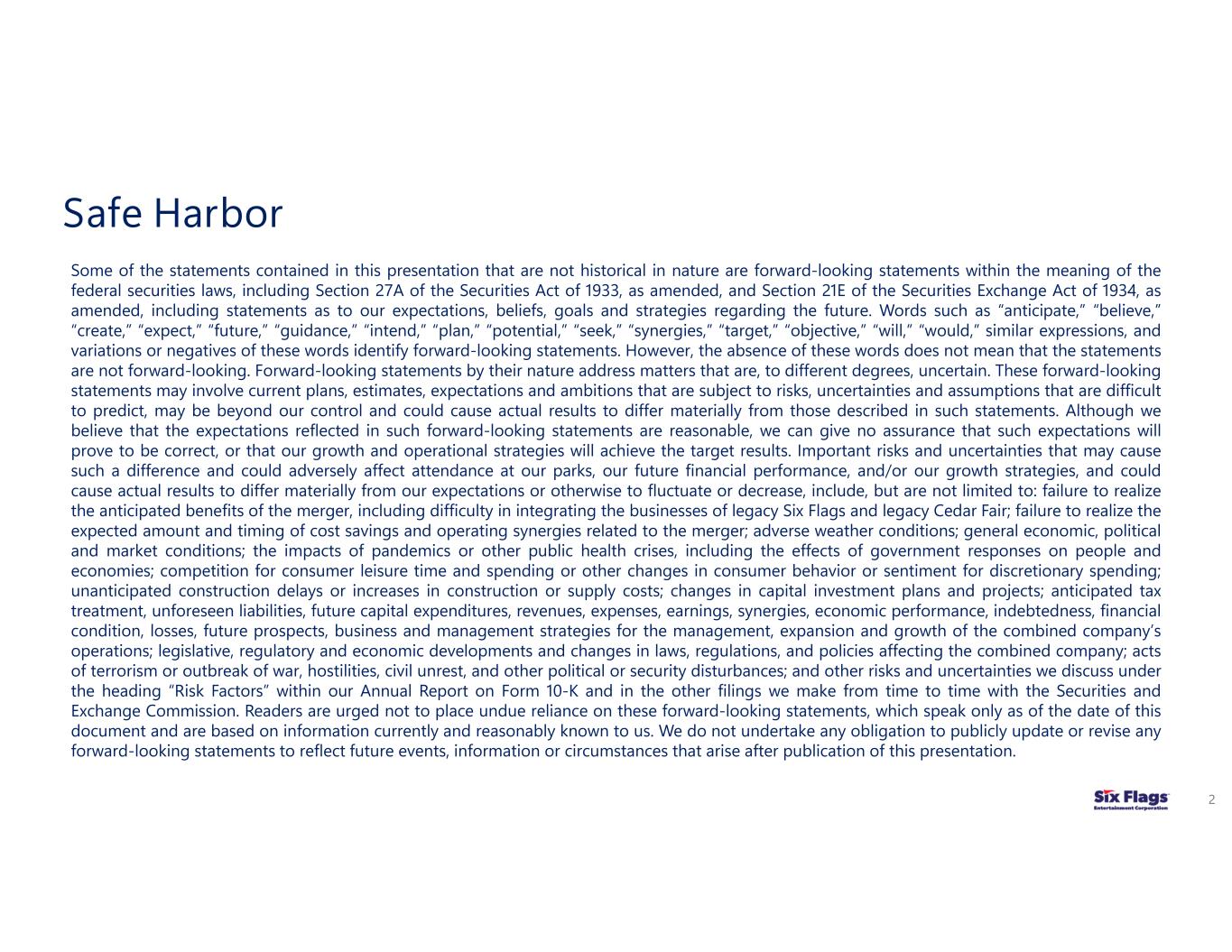 Important risks and uncertainties that may cause such a difference and could adversely affect attendance at our parks, our future financial performance, and/or our growth strategies, and could cause actual results to differ materially from our expectations or otherwise to fluctuate or decrease, include, but are not limited to: failure to realize the anticipated benefits of the merger, including difficulty in integrating the businesses of legacy Six Flags and legacy Cedar Fair; failure to realize the expected amount and timing of cost savings and operating synergies related to the merger; adverse weather conditions; general economic, political and market conditions; the impacts of pandemics or other public health crises, including the effects of government responses on people and economies; competition for consumer leisure time and spending or other changes in consumer behavior or sentiment for discretionary spending; unanticipated construction delays or increases in construction or supply costs; changes in capital investment plans and projects; anticipated tax treatment, unforeseen liabilities, future capital expenditures, revenues, expenses, earnings, synergies, economic performance, indebtedness, financial condition, losses, future prospects, business and management strategies for the management, expansion and growth of the Combined Company’s operations; legislative, regulatory and economic developments and changes in laws, regulations, and policies affecting the Combined Company; acts of terrorism or outbreak of war, hostilities, civil unrest, and other political or security disturbances; and other risks and uncertainties we discuss under the heading “Risk Factors” within our Annual Report on Form 10-K and in the other filings we make from time to time with the Securities and Exchange Commission. Readers are urged not to place undue reliance on these forward-looking statements, which speak only as of the date of this document and are based on information currently and reasonably known to us. We do not undertake any obligation to publicly update or revise any forward-looking statements to reflect future events, information or circumstances that arise after publication of this news release.