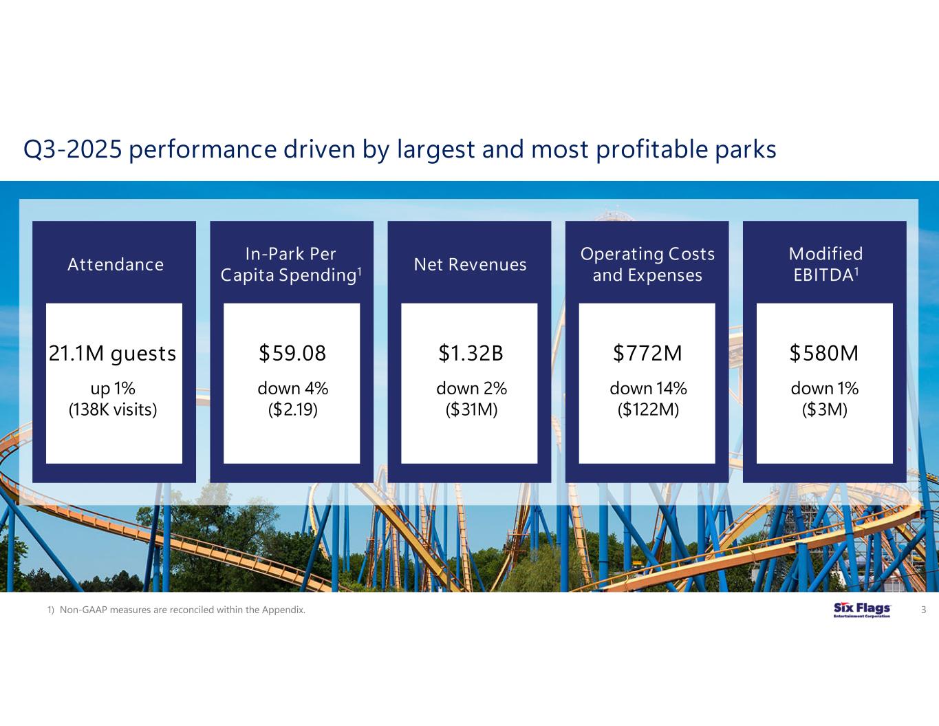 (2) In-park per capita spending, admissions per capita spending, per capita spending on in-park products, and out-of-park revenues are non-GAAP financial measures. See the attached reconciliation table and related footnote for the calculation of these metrics. These metrics are used by management as major factors in significant operational decisions as they are primary drivers of financial and operational performance, measuring demand, pricing, and consumer behavior.