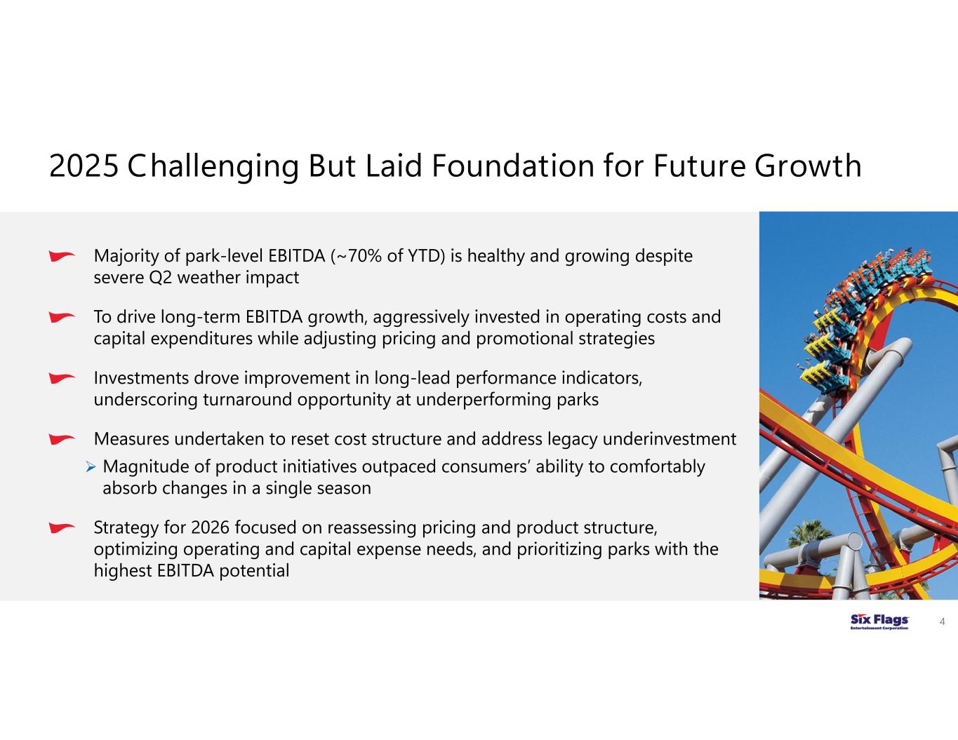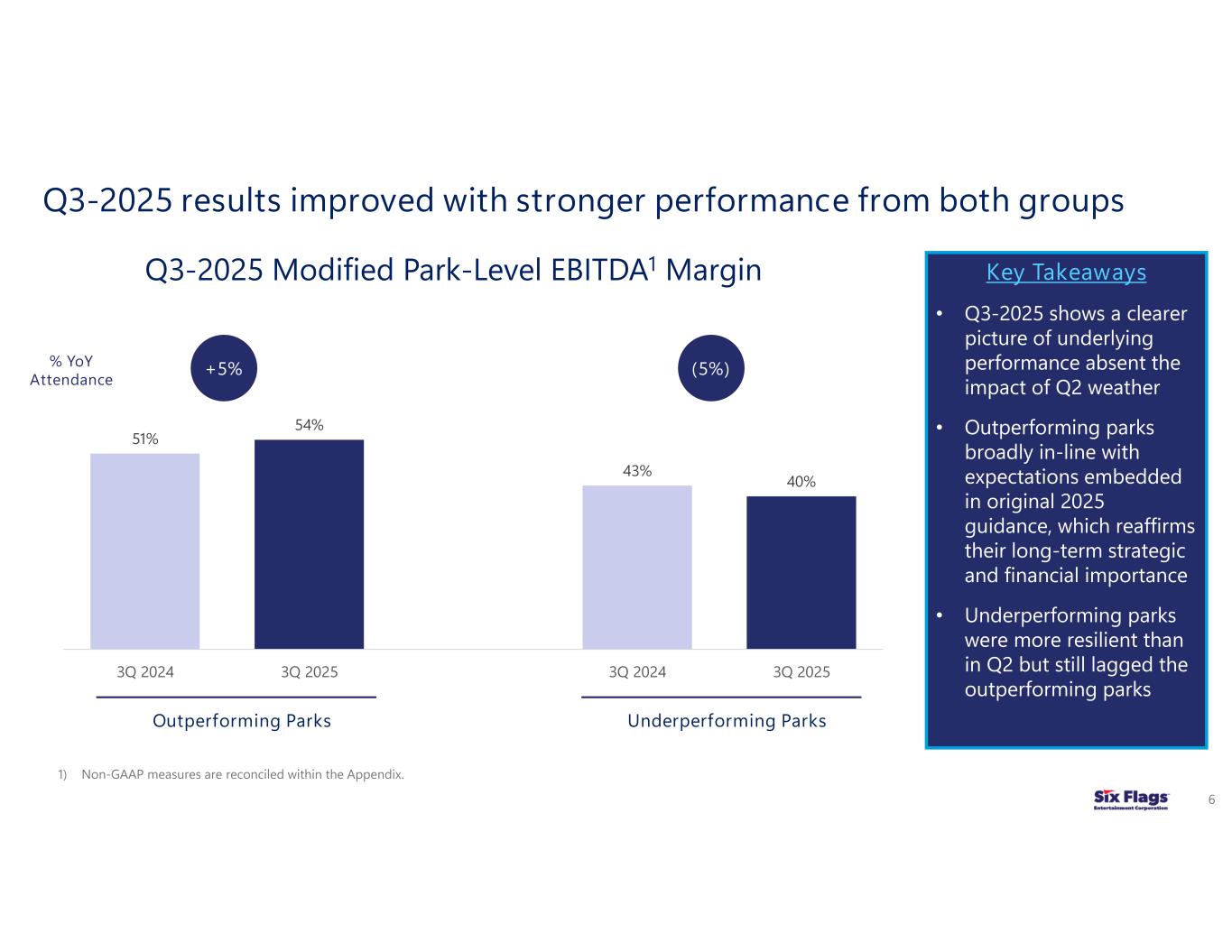 “We are very pleased that our largest and most established parks have continued to perform well during this challenging year,” continued Zimmerman. “This subset of Six Flags’ portfolio, which represents approximately 70% of park-level Modified EBITDA through the first nine months of 2025, has benefited from consistent investment in rides, attractions, and upgraded park facilities in recent years, all of which drive customer satisfaction and higher visitation. This year, several parks in this portfolio subset are on pace to deliver record or near-record results, validating our sound investments and strong consumer demand for the experiences our parks offer. Our teams remain focused on executing against our ongoing integration initiatives, sharpening our marketing messaging and strategies, and delivering an all-around better guest experience as we work to improve the value proposition of all our parks, and ensure we return to driving EBITDA growth across our portfolio.”
