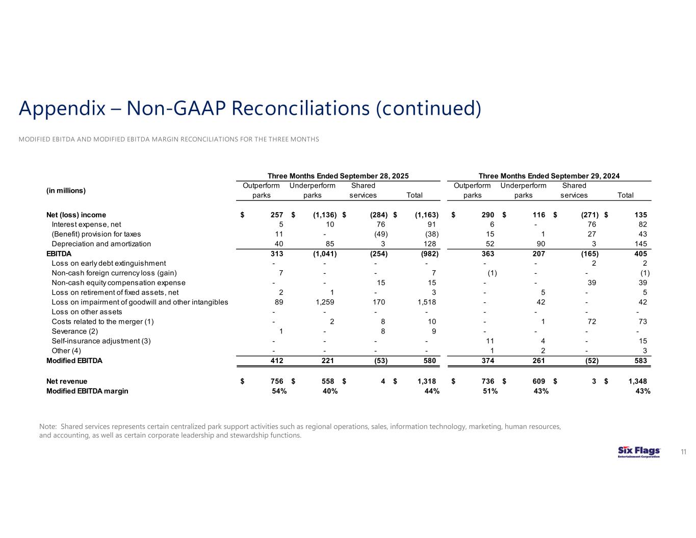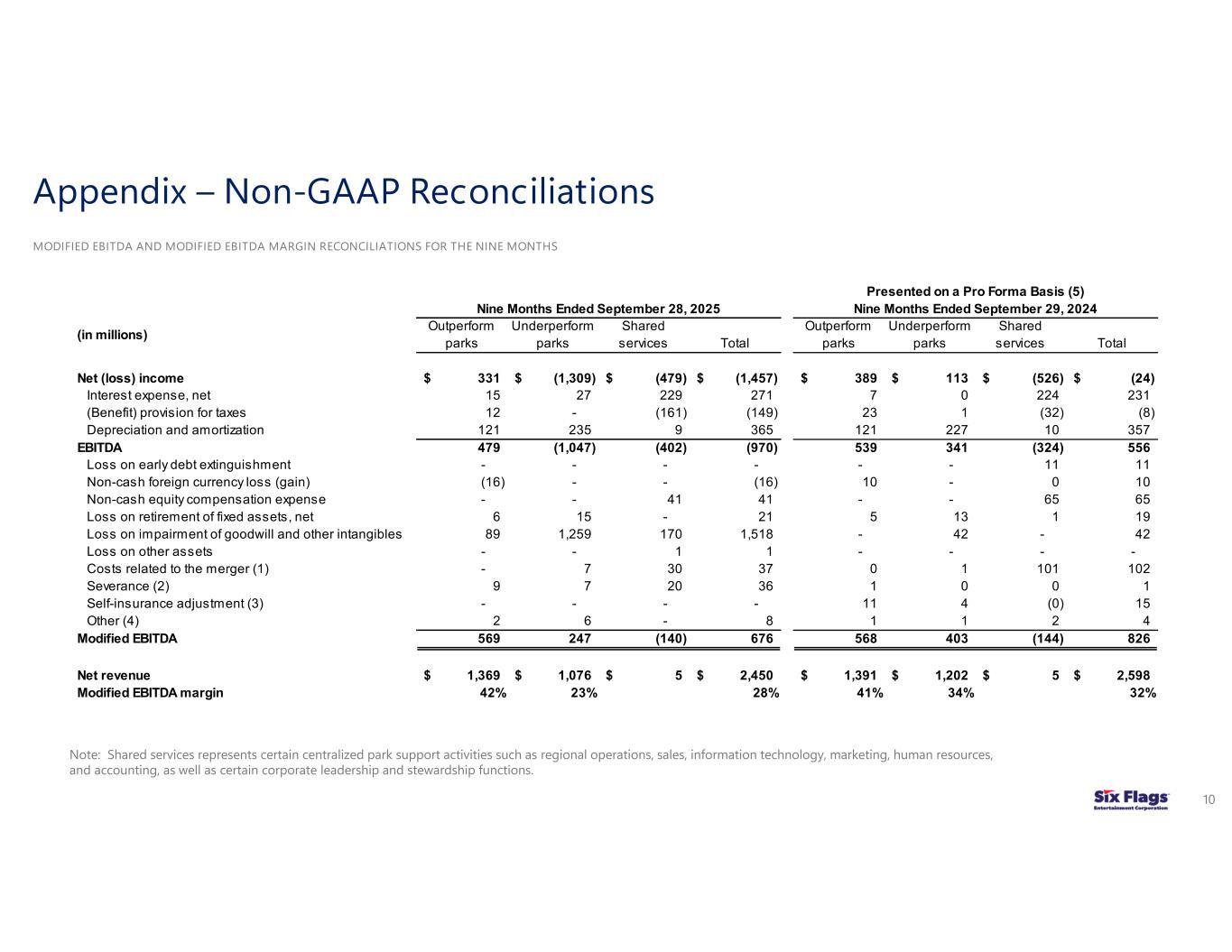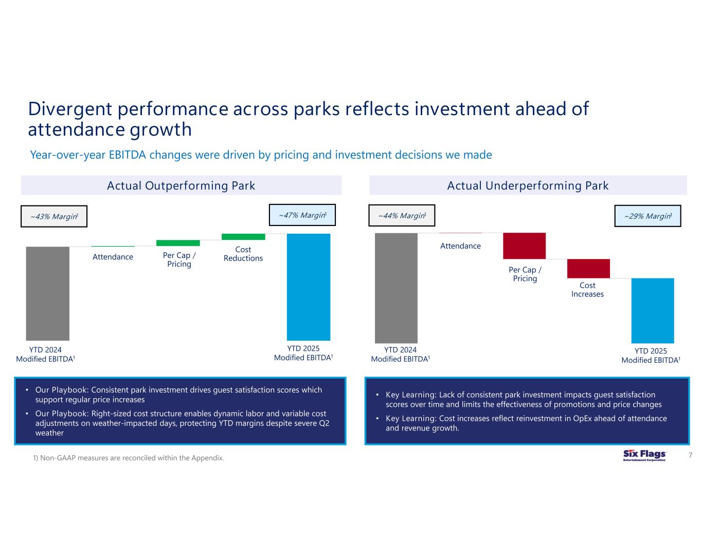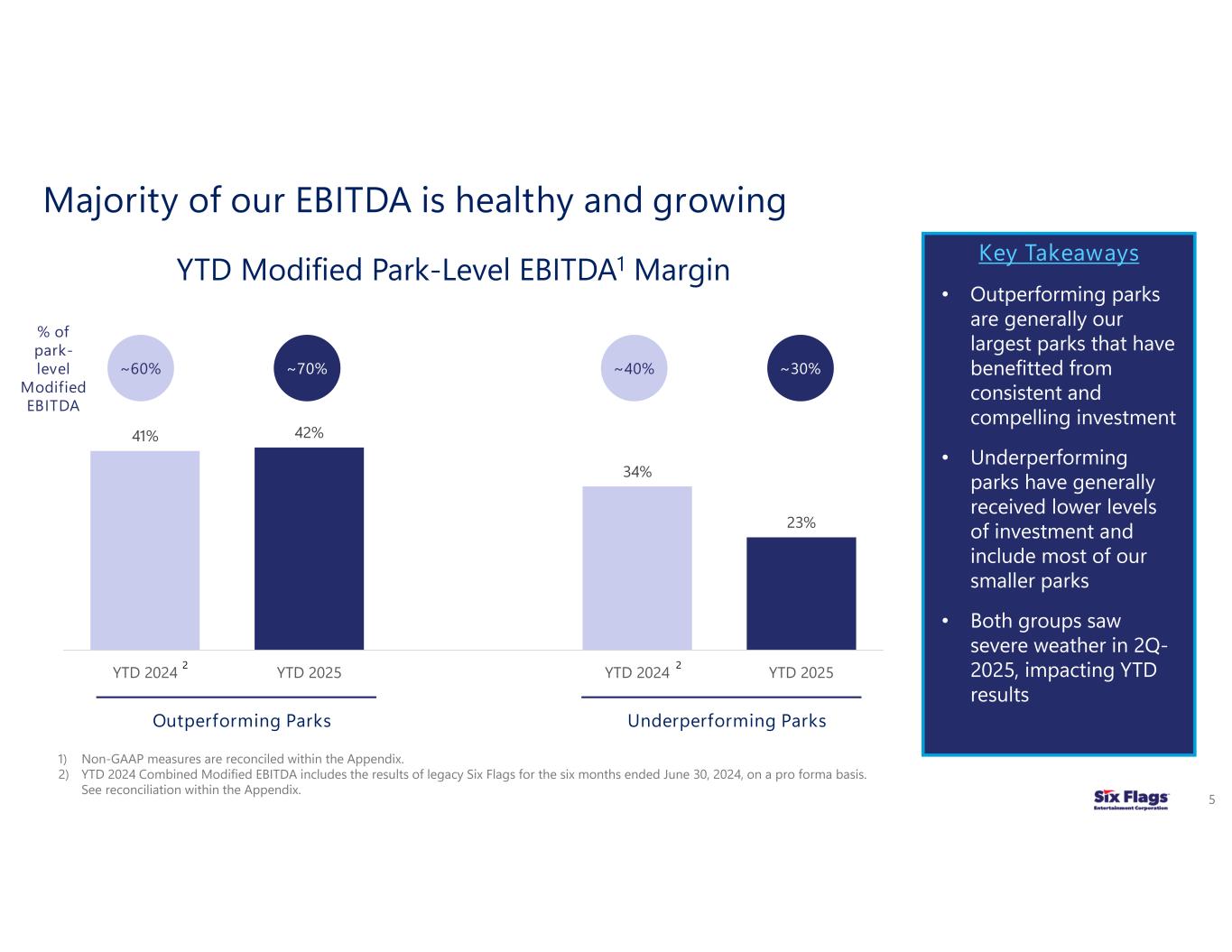 (6) Modified EBITDA margin (Modified EBITDA divided by net revenues) is not a measurement computed in accordance with GAAP and may not be comparable to similarly titled measures of other companies. Modified EBITDA margin is provided because management believes the measure provides a meaningful metric of operating profitability. Modified EBITDA margin has been disclosed as opposed to Adjusted EBITDA margin because management believes Modified EBITDA margin more accurately reflects the park-level operations of the Combined Company as it does not give effect to distributions to non-controlling interests.