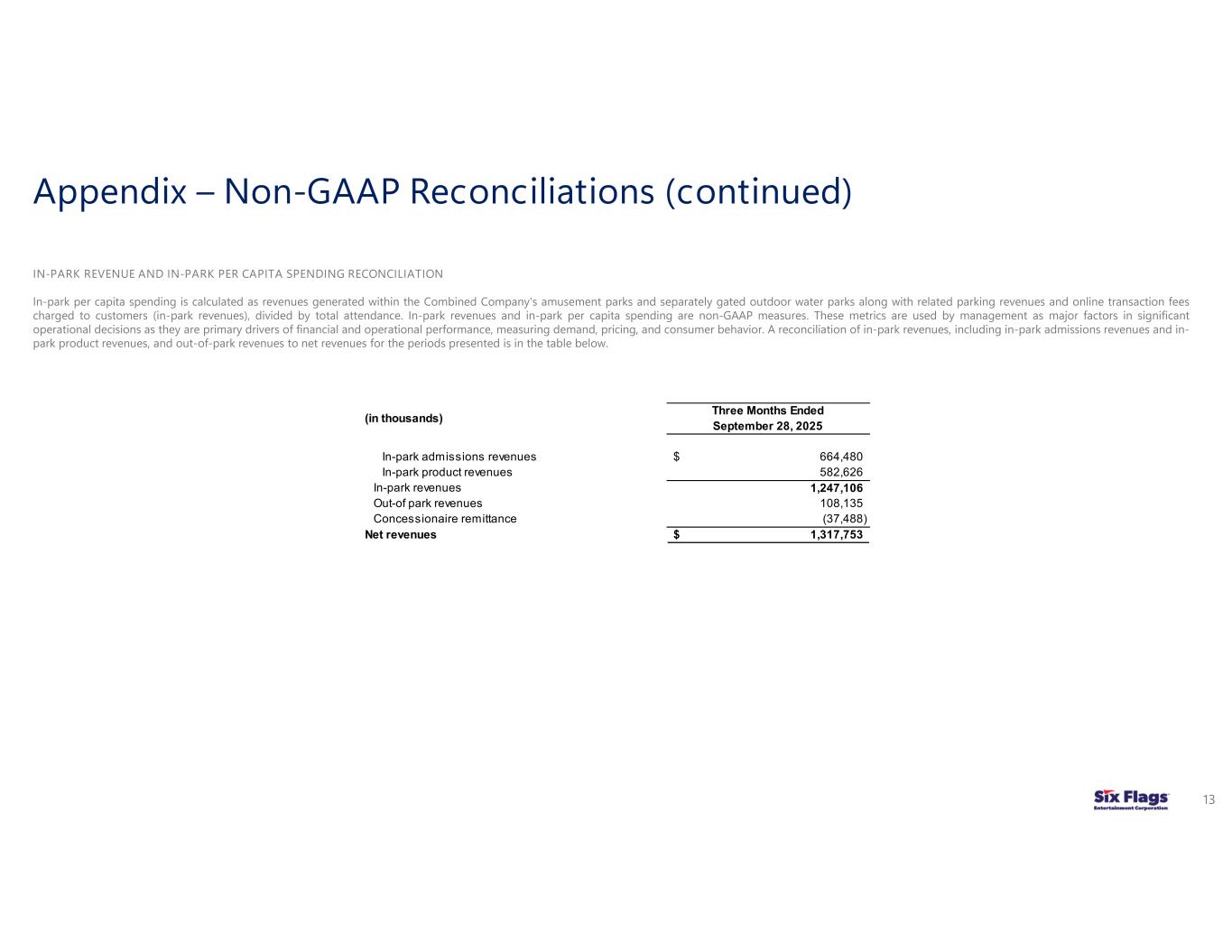 In-park revenues, in-park per capita spending, in-park admissions revenues, admissions per capita spending, in-park product revenues, per capita spending on in-park products, and out-of-park revenues are non-GAAP measures. These metrics are used by management as major factors in significant operational decisions as they are primary drivers of financial and operational performance, measuring demand, pricing, and consumer behavior. A reconciliation of in-park revenues, including in-park admissions revenues and in-park product revenues, and out-of-park revenues to net revenues for the periods presented is in the table below.