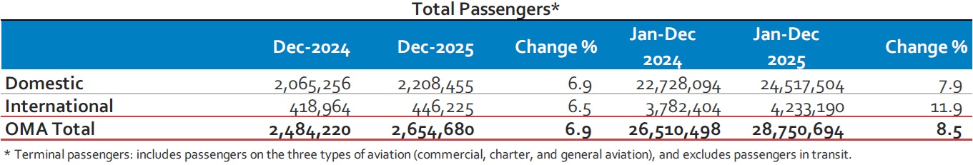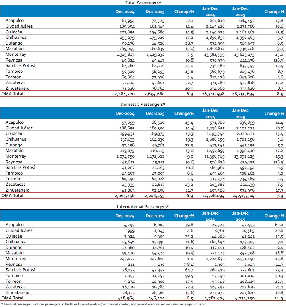 Mexico City, Mexico, January 7, 2026—Mexican airport operator Grupo Aeroportuario del Centro Norte, S.A.B. de C.V., known as OMA (NASDAQ: OMAB; BMV: OMA), reports that terminal passenger traffic at its 13 airports increased 6.9% in December 2025, as compared to December 2024. Domestic traffic increased 6.9%, and international traffic grew 6.5%.