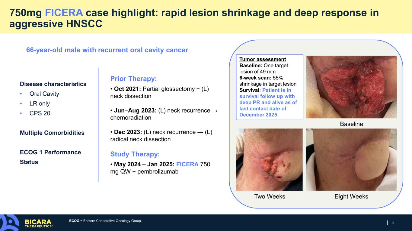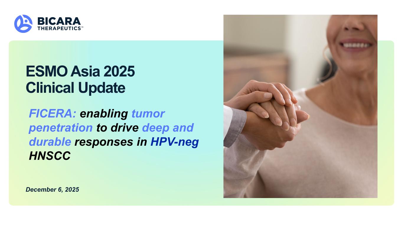 New biomarker data to be presented during Bicara’s corporate call and webcast show that 1500mg of ficerafusp alfa yielded a greater increase TGF-β inhibition within the tumor microenvironment and greater immune activation, compared to 750mg of ficerafusp alfa. The increased TGF-β inhibition in the tumor translated to greater depth of clinical responses at 24 weeks. The median depth of response was 82% at the 1500mg dose vs. 63% at the 750mg dose, and 64% of responders at 1500mg achieved a deep response, compared to 27% of responders at the 750mg dose. The totality of the data suggests that a higher dose of ficerafusp alfa with greater TGF-β inhibition and immune activation drives deeper tumor responses that translate to more durable outcomes for patients. Bicara plans to declare the optimal biologic dose for use in the pivotal FORTIFI-HN01 study in the first quarter of 2026. Conference Call and Webcast Details Bicara Therapeutics will host a conference call and webcast today December 6, 2025 at 9:00 a.m. ET. Individuals may register for the conference call by clicking the link here. Once registered, participants will receive dial-in details and a unique PIN which will allow them to access the call. An audio webcast will be accessible through the Investor Relations section of Bicara’s website under Events and Presentations. An archived replay will also be available for 30 days following the webcast. About Head and Neck Squamous Cell Carcinoma Head and neck squamous cell carcinomas (HNSCCs) develop from the mucosal epithelium in the oral cavity, pharynx and larynx and are the most common malignancies that arise in the head and neck. HNSCC is one of the most common cancers in the United States and globally with a rising incidence anticipated to reach one million new global cases annually by 2030. Ten percent of HNSCC patients are diagnosed with metastatic disease and up to 30% develop a recurrence or metastases over time after receiving initial treatment for advanced HNSCC. Most cases of HNSCC are thought to result from accumulated mutations caused by carcinogenic exposures such as tobacco smoke or HPV infection. Approximately 80% of patients with R/M HNSCC are HPV-negative. These HPV-negative tumors often exhibit a recurrence pattern that is primarily local and are associated with severe morbidities, including fatal tumor bleeding, intense pain, difficulty swallowing, significant weight loss, and cachexia. This highlights a critical unmet need for therapies that have the potential to deliver durable anti-tumor responses, ultimately leading to meaningful improvements in patients' quality of life. About Ficerafusp Alfa Ficerafusp alfa is a first-in-class bifunctional antibody designed to drive tumor penetration by breaking barriers in the tumor microenvironment that have challenged the treatment of multiple solid tumor cancers. Specifically, ficerafusp alfa combines two clinically validated targets: an epidermal growth factor receptor (EGFR) directed monoclonal antibody with a domain that binds to human transforming growth factor beta (TGF-β). Through this targeted mechanism, ficerafusp alfa reverses the fibrotic and immune- excluded tumor microenvironment driven by TGF-β signaling to enable tumor penetration that drives deep and durable responses. The U.S. Food and Drug Administration (FDA) has granted Breakthrough Therapy Designation to ficerafusp alfa in combination with pembrolizumab for the first line (1L) treatment of patients with metastatic or with unresectable, recurrent (R/M) head and neck squamous