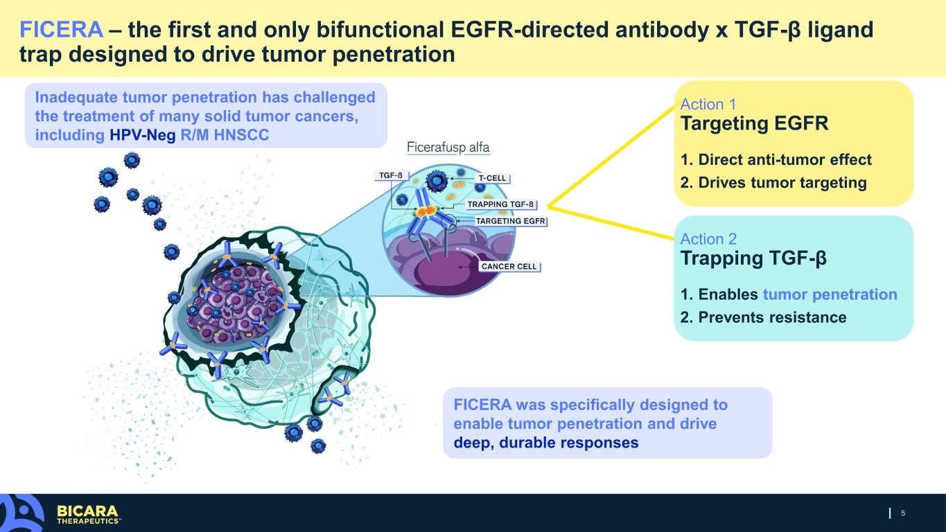 Ficerafusp Alfa (FICERA) in 1L R/M HPV-Negative HNSCC First and only EGFR x TGF-β bifunctional antibody 4 Granted Breakthrough Therapy Designation¥ ¥ U.S. FDA Breakthrough Therapy Designation or ficerafusp alfa in combination with pembrolizumab for the first-line (1L) treatment of patients with metastatic or with unresectable, recurrent (R/M) head and neck squamous cell carcinoma (HNSCC) whose tumors express programmed death-ligand 1 with combined positive score (CPS) ≥1, excluding human papillomavirus (HPV)-positive oropharyngeal squamous cell carcinoma.
