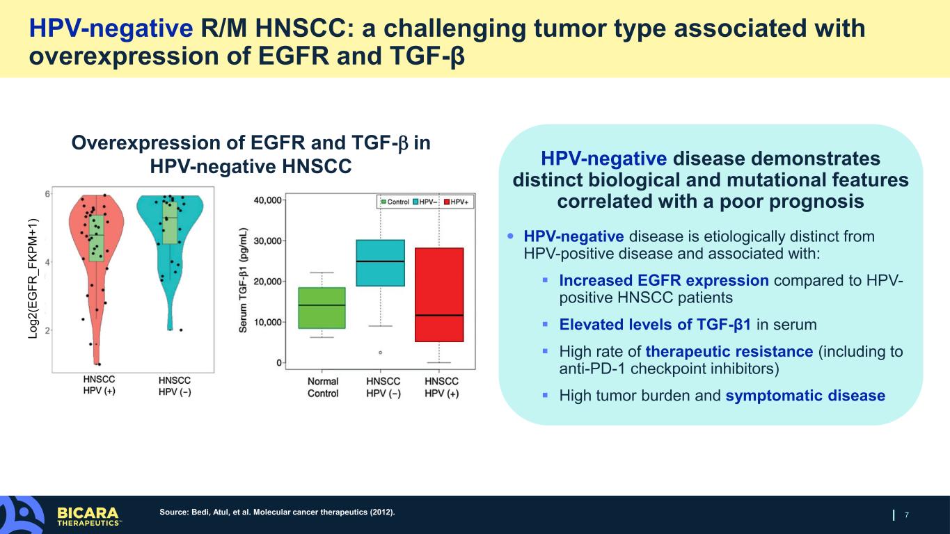 6 1L HPV-negative R/M HNSCC is a sizable and growing market • Head and neck cancer accounts for ~4% of all cancers in the U.S. • Squamous cell carcinomas represent ~90% of H&N • Oropharyngeal lesions are typically tested for HPV HPV-positive caused by HPV infection HPV-negative typically caused by smoking and chewing tobacco represents 80% of HNSCC in the R/M setting and carries a worse prognosis vs. HPV-positive • Treatment decisions are guided by CPS or PD-L1 expression and options are limited to cetuximab, anti-PD1, chemotherapy Sources: Cancer.net, Cleveland Clinic (2022); SEER 2012-2018 data; Cerner (2022); Bedi et al. Mol Cancer Ther. 2012; Acta Otorhinolaryngol Ital. 2020, KeyNote-048 ph.3 trial; ASCO (2022); DRG HNSCC (2019) CPS = combined positive score. Significant and growing population Annual cases of HNSCC in U.S. High rates of recurrence/metastases Annual cases of R/M HNSCC in U.S. Most patients are HPV-negative ~80% of cases have worse outcomes ~23,000 ~67,000 ~18,400 Annual Cases in U.S.
