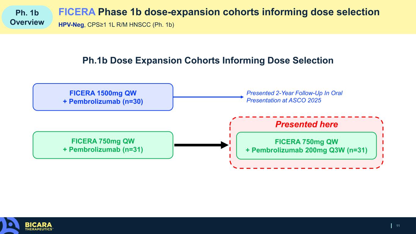10 Ongoing FORTIFI-HN01 trial design allows for efficient path-to-market R/M HNSCC 1L Setting CPS ≥ 1 excl. HPV-positive OPSCC R FICERA 1500mg QW + Pembro 200mg Q3W FICERA 750mg QW + Pembro 200mg Q3W Pembro 200mg Q3W FICERA optimal dose + Pembro 200mg Q3W Dose Selection Endpoint: ORR (primary) Endpoint: OS (primary) 1Q 2026 Interim Analysis & Potential Accelerated Approval Potential Full Approval Q3W = every 3 weeks; ORR = objective response rate; OS = overall survival Anticipate optimal dose selection in 1Q 2026