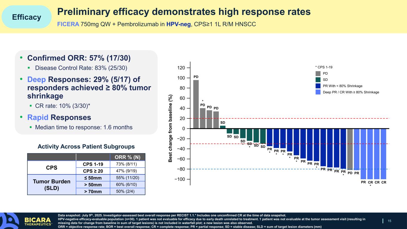 14 Safety Data snapshot: July 9th, 2025. *TRAEs includes TEAEs possibly, probably, or definitely related to ficerafusp alfa; also includes TEAEs with missing drug relationships. †n=1 each for TEAEs leading to dose reduction and discontinuation. AE = adverse event; TEAE = treatment-emergent adverse event; TRAE = treatment related adverse event. FICERA continues to exhibit a generally well-tolerated safety profile FICERA 750mg QW + Pembrolizumab in HPV-neg, CPS≥1 1L R/M HNSCC 750mg QW FICERA + Pembrolizumab safety profile: • The combination was tolerable with a manageable safety profile • No treatment-related deaths were reported • Safety profile at 750 mg was consistent with established safety profile of 1500mg FICERA + pembrolizumab in R/M HNSCC Preferred term, n (%) Safety set (N=31) Any grade Grade 3 Grade 4/5 Any TRAE 31 (100) 13 (42) 0 Dermatitis acneiform 26 (84) 1 (3) 0 Pruritus 12 (39) 1 (3) 0 Fatigue 12 (39) 0 0 Stomatitis 10 (32) 3 (10) 0 Epistaxis 10 (32) 1 (3) 0 Dry skin 10 (32) 0 0 Skin fissures 9 (29) 0 0 Hypophosphatemia 9 (29) 0 0 Anemia 8 (26) 3 (10) 0 Hypomagnesemia 7 (23) 0 0 Hypokalemia 7 (23) 2 (6) 0 Lipase increased 7 (23) 0 0 Amylase increased 7 (23) 0 0 TRAE leading to ficerafusp alfa discontinuation† 2 (6%) Most common (>20%) adverse events related to FICERA*