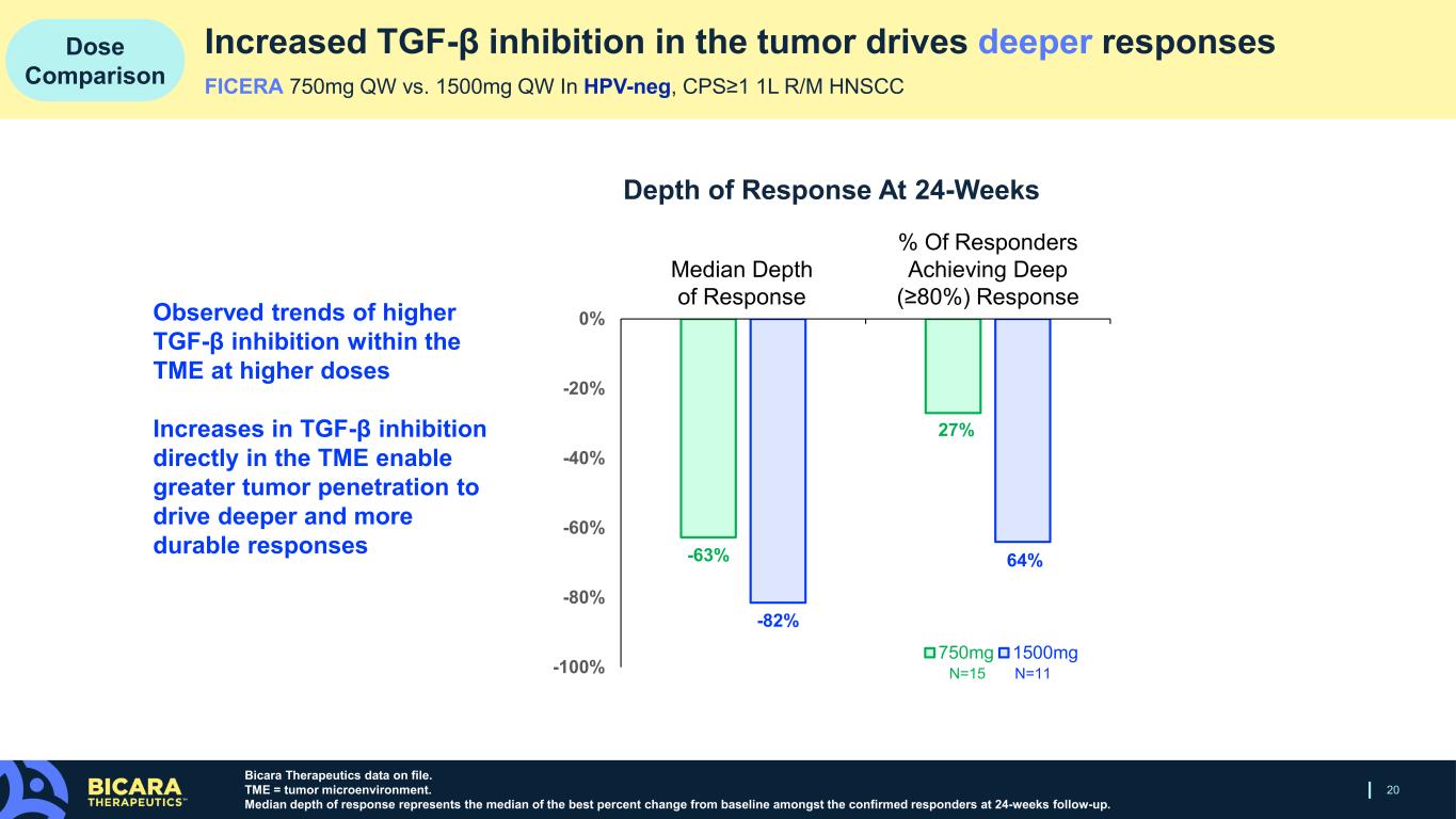 19 Biomarkers By Dose Bicara Therapeutics data on file. Plots show mean with SEM. **p ≤ 0.01 pSMAD2 Analysis: N=5 samples at 750mg, N=7 samples at 1500mg. Immune-activation cytokine analysis: N=24 samples for 750mg (except N=25 for CXCL10), N=27 for 1500mg. Higher doses of FICERA demonstrate increased TGF-β inhibition FICERA 750mg QW vs. 1500mg QW In HPV-neg, CPS≥1 1L R/M HNSCC pSMAD2 Tumor tissue 750mg 1500mg -50 -40 -30 -20 -10 0 % C ha ng e fr om B as el in e ns IFNGTNF-a CXCL9 CXCL10 Blood 1500mg of FICERA shows a trend for increased TGF-β inhibition in the tumor and increased pro-inflammatory cytokines in the blood vs. 750mg of FICERA Increased TGF-β Inhibition at 1500mg vs. 750mg Increased Immune-Activation at 1500mg vs. 750mg