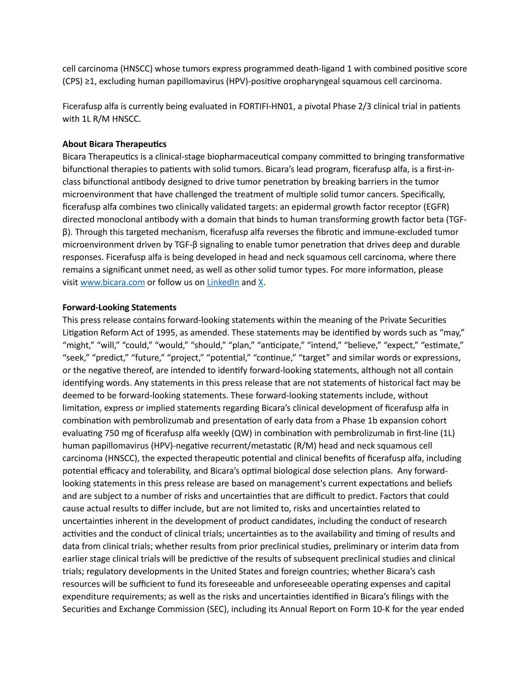 cell carcinoma (HNSCC) whose tumors express programmed death-ligand 1 with combined positive score (CPS) ≥1, excluding human papillomavirus (HPV)-positive oropharyngeal squamous cell carcinoma. Ficerafusp alfa is currently being evaluated in FORTIFI-HN01, a pivotal Phase 2/3 clinical trial in patients with 1L R/M HNSCC. About Bicara Therapeutics Bicara Therapeutics is a clinical-stage biopharmaceutical company committed to bringing transformative bifunctional therapies to patients with solid tumors. Bicara’s lead program, ficerafusp alfa, is a first-in- class bifunctional antibody designed to drive tumor penetration by breaking barriers in the tumor microenvironment that have challenged the treatment of multiple solid tumor cancers. Specifically, ficerafusp alfa combines two clinically validated targets: an epidermal growth factor receptor (EGFR) directed monoclonal antibody with a domain that binds to human transforming growth factor beta (TGF- β). Through this targeted mechanism, ficerafusp alfa reverses the fibrotic and immune-excluded tumor microenvironment driven by TGF-β signaling to enable tumor penetration that drives deep and durable responses. Ficerafusp alfa is being developed in head and neck squamous cell carcinoma, where there remains a significant unmet need, as well as other solid tumor types. For more information, please visit www.bicara.com or follow us on LinkedIn and X. Forward-Looking Statements This press release contains forward-looking statements within the meaning of the Private Securities Litigation Reform Act of 1995, as amended. These statements may be identified by words such as “may,” “might,” “will,” “could,” “would,” “should,” “plan,” “anticipate,” “intend,” “believe,” “expect,” “estimate,” “seek,” “predict,” “future,” “project,” “potential,” “continue,” “target” and similar words or expressions, or the negative thereof, are intended to identify forward-looking statements, although not all contain identifying words. Any statements in this press release that are not statements of historical fact may be deemed to be forward-looking statements. These forward-looking statements include, without limitation, express or implied statements regarding Bicara’s clinical development of ficerafusp alfa in combination with pembrolizumab and presentation of early data from a Phase 1b expansion cohort evaluating 750 mg of ficerafusp alfa weekly (QW) in combination with pembrolizumab in first-line (1L) human papillomavirus (HPV)-negative recurrent/metastatic (R/M) head and neck squamous cell carcinoma (HNSCC), the expected therapeutic potential and clinical benefits of ficerafusp alfa, including potential efficacy and tolerability, and Bicara’s optimal biological dose selection plans. Any forward- looking statements in this press release are based on management's current expectations and beliefs and are subject to a number of risks and uncertainties that are difficult to predict. Factors that could cause actual results to differ include, but are not limited to, risks and uncertainties related to uncertainties inherent in the development of product candidates, including the conduct of research activities and the conduct of clinical trials; uncertainties as to the availability and timing of results and data from clinical trials; whether results from prior preclinical studies, preliminary or interim data from earlier stage clinical trials will be predictive of the results of subsequent preclinical studies and clinical trials; regulatory developments in the United States and foreign countries; whether Bicara’s cash resources will be sufficient to fund its foreseeable and unforeseeable operating expenses and capital expenditure requirements; as well as the risks and uncertainties identified in Bicara’s filings with the Securities and Exchange Commission (SEC), including its Annual Report on Form 10-K for the year ended