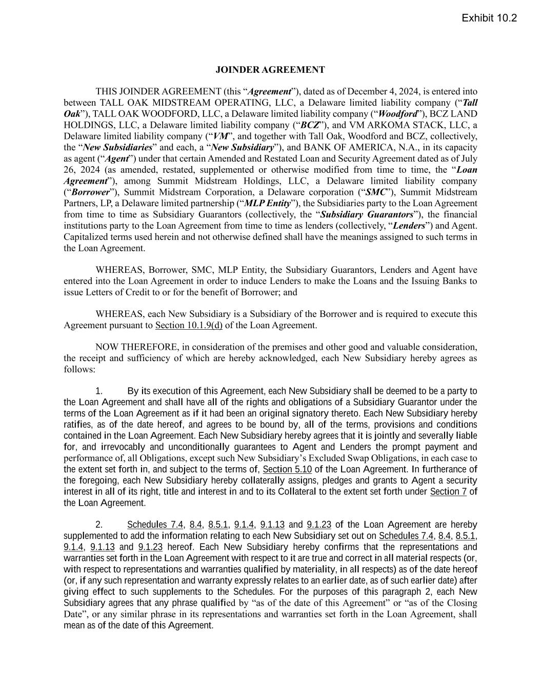 JOINDER AGREEMENT THIS JOINDER AGREEMENT (this “Agreement”), dated as of December 4, 2024, is entered into between TALL OAK MIDSTREAM OPERATING, LLC, a Delaware limited liability company (“Tall Oak”), TALL OAK WOODFORD, LLC, a Delaware limited liability company (“Woodford”), BCZ LAND HOLDINGS, LLC, a Delaware limited liability company (“BCZ”), and VM ARKOMA STACK, LLC, a Delaware limited liability company (“VM”, and together with Tall Oak, Woodford and BCZ, collectively, the “New Subsidiaries” and each, a “New Subsidiary”), and BANK OF AMERICA, N.A., in its capacity as agent (“Agent”) under that certain Amended and Restated Loan and Security Agreement dated as of July 26, 2024 (as amended, restated, supplemented or otherwise modified from time to time, the “Loan Agreement”), among Summit Midstream Holdings, LLC, a Delaware limited liability company (“Borrower”), Summit Midstream Corporation, a Delaware corporation (“SMC”), Summit Midstream Partners, LP, a Delaware limited partnership (“MLP Entity”), the Subsidiaries party to the Loan Agreement from time to time as Subsidiary Guarantors (collectively, the “Subsidiary Guarantors”), the financial institutions party to the Loan Agreement from time to time as lenders (collectively, “Lenders”) and Agent. Capitalized terms used herein and not otherwise defined shall have the meanings assigned to such terms in the Loan Agreement. WHEREAS, Borrower, SMC, MLP Entity, the Subsidiary Guarantors, Lenders and Agent have entered into the Loan Agreement in order to induce Lenders to make the Loans and the Issuing Banks to issue Letters of Credit to or for the benefit of Borrower; and WHEREAS, each New Subsidiary is a Subsidiary of the Borrower and is required to execute this Agreement pursuant to Section 10.1.9(d) of the Loan Agreement. NOW THEREFORE, in consideration of the premises and other good and valuable consideration, the receipt and sufficiency of which are hereby acknowledged, each New Subsidiary hereby agrees as follows: 1. By its execution of this Agreement, each New Subsidiary shall be deemed to be a party to the Loan Agreement and shall have all of the rights and obligations of a Subsidiary Guarantor under the terms of the Loan Agreement as if it had been an original signatory thereto. Each New Subsidiary hereby ratifies, as of the date hereof, and agrees to be bound by, all of the terms, provisions and conditions contained in the Loan Agreement. Each New Subsidiary hereby agrees that it is jointly and severally liable for, and irrevocably and unconditionally guarantees to Agent and Lenders the prompt payment and performance of, all Obligations, except such New Subsidiary’s Excluded Swap Obligations, in each case to the extent set forth in, and subject to the terms of, Section 5.10 of the Loan Agreement. In furtherance of the foregoing, each New Subsidiary hereby collaterally assigns, pledges and grants to Agent a security interest in all of its right, title and interest in and to its Collateral to the extent set forth under Section 7 of the Loan Agreement. 2. Schedules 7.4, 8.4, 8.5.1, 9.1.4, 9.1.13 and 9.1.23 of the Loan Agreement are hereby supplemented to add the information relating to each New Subsidiary set out on Schedules 7.4, 8.4, 8.5.1, 9.1.4, 9.1.13 and 9.1.23 hereof. Each New Subsidiary hereby confirms that the representations and warranties set forth in the Loan Agreement with respect to it are true and correct in all material respects (or, with respect to representations and warranties qualified by materiality, in all respects) as of the date hereof (or, if any such representation and warranty expressly relates to an earlier date, as of such earlier date) after giving effect to such supplements to the Schedules. For the purposes of this paragraph 2, each New Subsidiary agrees that any phrase qualified by “as of the date of this Agreement” or “as of the Closing Date”, or any similar phrase in its representations and warranties set forth in the Loan Agreement, shall mean as of the date of this Agreement. Exhibit 10.2