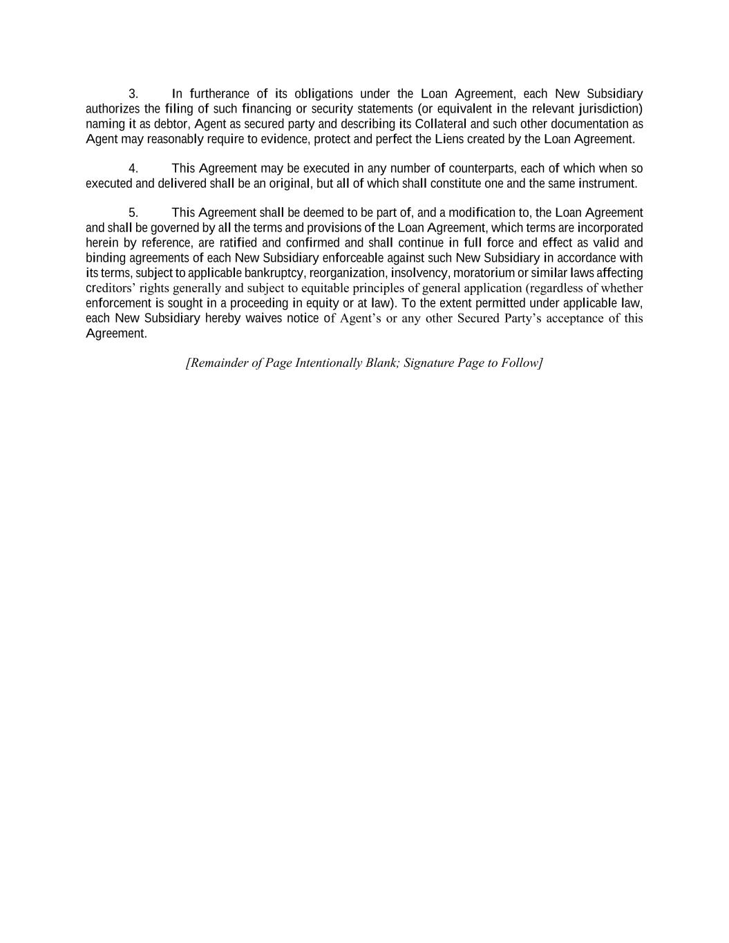 3. In furtherance of its obligations under the Loan Agreement, each New Subsidiary authorizes the filing of such financing or security statements (or equivalent in the relevant jurisdiction) naming it as debtor, Agent as secured party and describing its Collateral and such other documentation as Agent may reasonably require to evidence, protect and perfect the Liens created by the Loan Agreement. 4. This Agreement may be executed in any number of counterparts, each of which when so executed and delivered shall be an original, but all of which shall constitute one and the same instrument. 5. This Agreement shall be deemed to be part of, and a modification to, the Loan Agreement and shall be governed by all the terms and provisions of the Loan Agreement, which terms are incorporated herein by reference, are ratified and confirmed and shall continue in full force and effect as valid and binding agreements of each New Subsidiary enforceable against such New Subsidiary in accordance with its terms, subject to applicable bankruptcy, reorganization, insolvency, moratorium or similar laws affecting creditors’ rights generally and subject to equitable principles of general application (regardless of whether enforcement is sought in a proceeding in equity or at law). To the extent permitted under applicable law, each New Subsidiary hereby waives notice of Agent’s or any other Secured Party’s acceptance of this Agreement. [Remainder of Page Intentionally Blank; Signature Page to Follow]