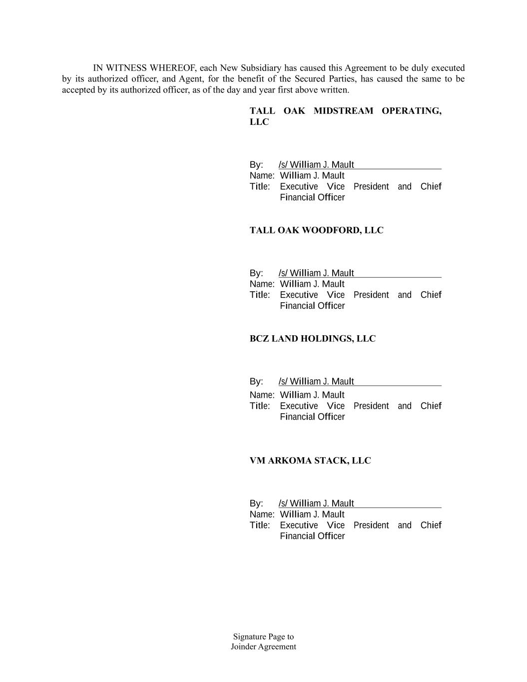 Signature Page to Joinder Agreement IN WITNESS WHEREOF, each New Subsidiary has caused this Agreement to be duly executed by its authorized officer, and Agent, for the benefit of the Secured Parties, has caused the same to be accepted by its authorized officer, as of the day and year first above written. TALL OAK MIDSTREAM OPERATING, LLC By: /s/ William J. Mault Name: William J. Mault Title: Executive Vice President and Chief Financial Officer TALL OAK WOODFORD, LLC By: /s/ William J. Mault Name: William J. Mault Title: Executive Vice President and Chief Financial Officer BCZ LAND HOLDINGS, LLC By: /s/ William J. Mault Name: William J. Mault Title: Executive Vice President and Chief Financial Officer VM ARKOMA STACK, LLC By: /s/ William J. Mault Name: William J. Mault Title: Executive Vice President and Chief Financial Officer