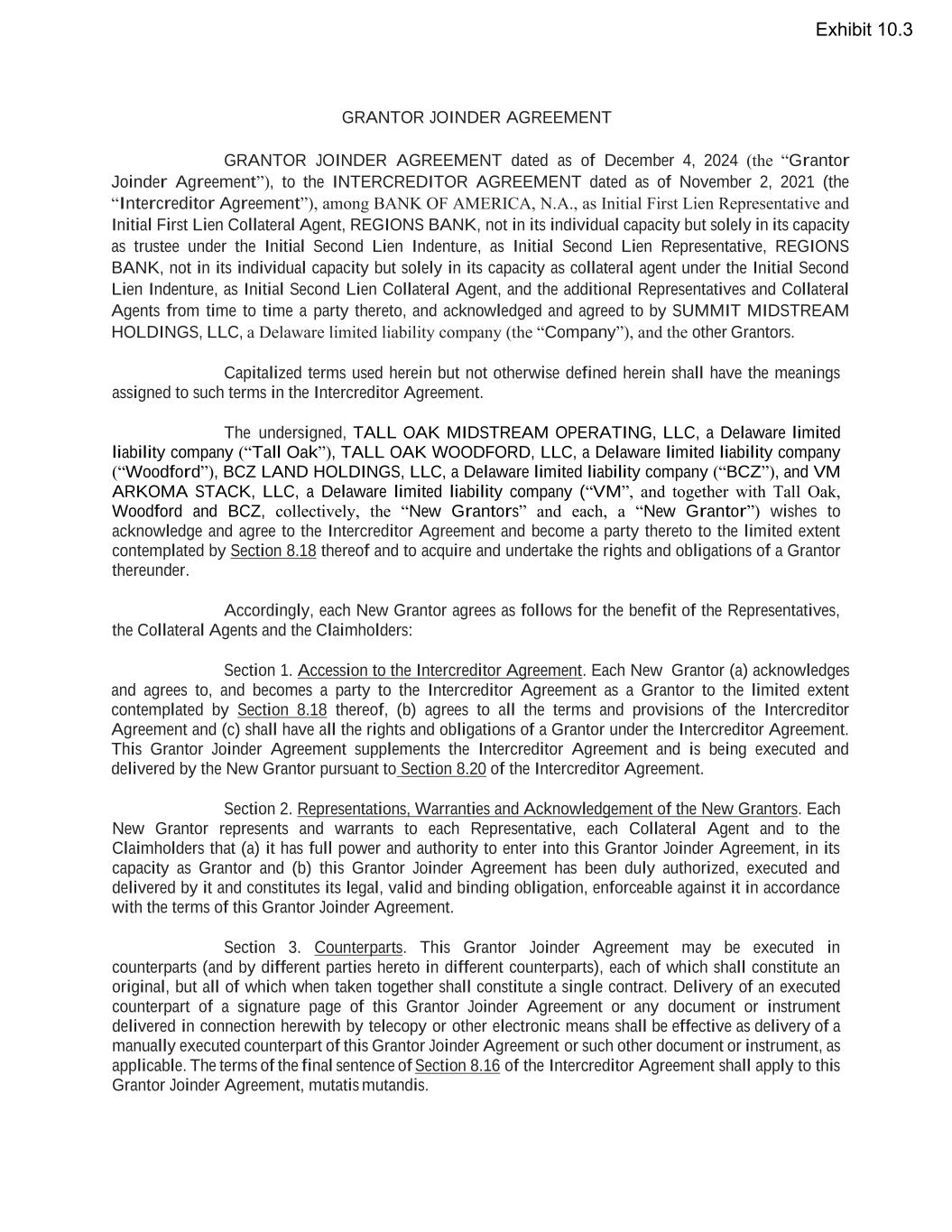 GRANTOR JOINDER AGREEMENT GRANTOR JOINDER AGREEMENT dated as of December 4, 2024 (the “Grantor Joinder Agreement”), to the INTERCREDITOR AGREEMENT dated as of November 2, 2021 (the “Intercreditor Agreement”), among BANK OF AMERICA, N.A., as Initial First Lien Representative and Initial First Lien Collateral Agent, REGIONS BANK, not in its individual capacity but solely in its capacity as trustee under the Initial Second Lien Indenture, as Initial Second Lien Representative, REGIONS BANK, not in its individual capacity but solely in its capacity as collateral agent under the Initial Second Lien Indenture, as Initial Second Lien Collateral Agent, and the additional Representatives and Collateral Agents from time to time a party thereto, and acknowledged and agreed to by SUMMIT MIDSTREAM HOLDINGS, LLC, a Delaware limited liability company (the “Company”), and the other Grantors. Capitalized terms used herein but not otherwise defined herein shall have the meanings assigned to such terms in the Intercreditor Agreement. The undersigned, TALL OAK MIDSTREAM OPERATING, LLC, a Delaware limited liability company (“Tall Oak”), TALL OAK WOODFORD, LLC, a Delaware limited liability company (“Woodford”), BCZ LAND HOLDINGS, LLC, a Delaware limited liability company (“BCZ”), and VM ARKOMA STACK, LLC, a Delaware limited liability company (“VM”, and together with Tall Oak, Woodford and BCZ, collectively, the “New Grantors” and each, a “New Grantor”) wishes to acknowledge and agree to the Intercreditor Agreement and become a party thereto to the limited extent contemplated by Section 8.18 thereof and to acquire and undertake the rights and obligations of a Grantor thereunder. Accordingly, each New Grantor agrees as follows for the benefit of the Representatives, the Collateral Agents and the Claimholders: Section 1. Accession to the Intercreditor Agreement. Each New Grantor (a) acknowledges and agrees to, and becomes a party to the Intercreditor Agreement as a Grantor to the limited extent contemplated by Section 8.18 thereof, (b) agrees to all the terms and provisions of the Intercreditor Agreement and (c) shall have all the rights and obligations of a Grantor under the Intercreditor Agreement. This Grantor Joinder Agreement supplements the Intercreditor Agreement and is being executed and delivered by the New Grantor pursuant to Section 8.20 of the Intercreditor Agreement. Section 2. Representations, Warranties and Acknowledgement of the New Grantors. Each New Grantor represents and warrants to each Representative, each Collateral Agent and to the Claimholders that (a) it has full power and authority to enter into this Grantor Joinder Agreement, in its capacity as Grantor and (b) this Grantor Joinder Agreement has been duly authorized, executed and delivered by it and constitutes its legal, valid and binding obligation, enforceable against it in accordance with the terms of this Grantor Joinder Agreement. Section 3. Counterparts. This Grantor Joinder Agreement may be executed in counterparts (and by different parties hereto in different counterparts), each of which shall constitute an original, but all of which when taken together shall constitute a single contract. Delivery of an executed counterpart of a signature page of this Grantor Joinder Agreement or any document or instrument delivered in connection herewith by telecopy or other electronic means shall be effective as delivery of a manually executed counterpart of this Grantor Joinder Agreement or such other document or instrument, as applicable. The terms of the final sentence of Section 8.16 of the Intercreditor Agreement shall apply to this Grantor Joinder Agreement, mutatis mutandis. Exhibit 10.3