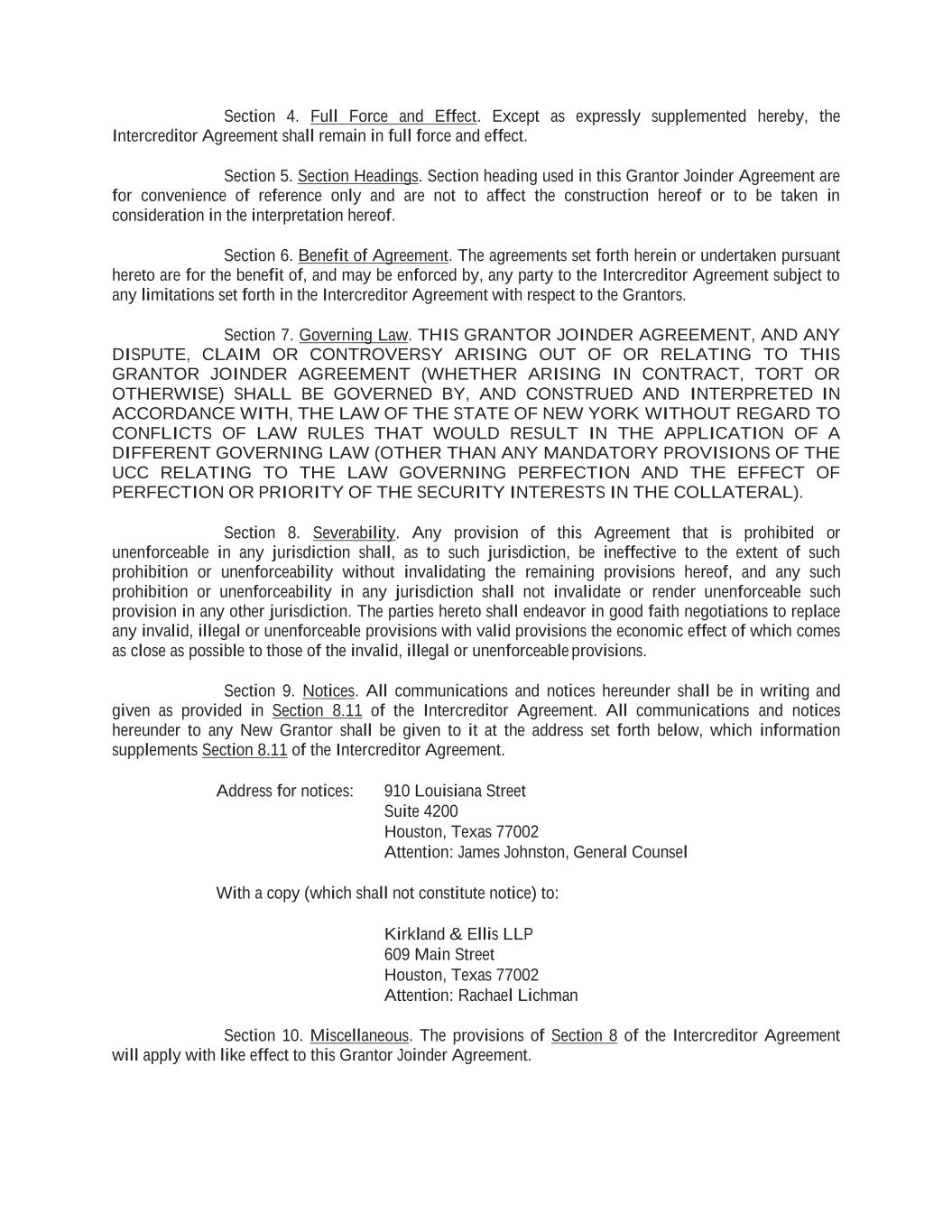 Section 4. Full Force and Effect. Except as expressly supplemented hereby, the Intercreditor Agreement shall remain in full force and effect. Section 5. Section Headings. Section heading used in this Grantor Joinder Agreement are for convenience of reference only and are not to affect the construction hereof or to be taken in consideration in the interpretation hereof. Section 6. Benefit of Agreement. The agreements set forth herein or undertaken pursuant hereto are for the benefit of, and may be enforced by, any party to the Intercreditor Agreement subject to any limitations set forth in the Intercreditor Agreement with respect to the Grantors. Section 7. Governing Law. THIS GRANTOR JOINDER AGREEMENT, AND ANY DISPUTE, CLAIM OR CONTROVERSY ARISING OUT OF OR RELATING TO THIS GRANTOR JOINDER AGREEMENT (WHETHER ARISING IN CONTRACT, TORT OR OTHERWISE) SHALL BE GOVERNED BY, AND CONSTRUED AND INTERPRETED IN ACCORDANCE WITH, THE LAW OF THE STATE OF NEW YORK WITHOUT REGARD TO CONFLICTS OF LAW RULES THAT WOULD RESULT IN THE APPLICATION OF A DIFFERENT GOVERNING LAW (OTHER THAN ANY MANDATORY PROVISIONS OF THE UCC RELATING TO THE LAW GOVERNING PERFECTION AND THE EFFECT OF PERFECTION OR PRIORITY OF THE SECURITY INTERESTS IN THE COLLATERAL). Section 8. Severability. Any provision of this Agreement that is prohibited or unenforceable in any jurisdiction shall, as to such jurisdiction, be ineffective to the extent of such prohibition or unenforceability without invalidating the remaining provisions hereof, and any such prohibition or unenforceability in any jurisdiction shall not invalidate or render unenforceable such provision in any other jurisdiction. The parties hereto shall endeavor in good faith negotiations to replace any invalid, illegal or unenforceable provisions with valid provisions the economic effect of which comes as close as possible to those of the invalid, illegal or unenforceable provisions. Section 9. Notices. All communications and notices hereunder shall be in writing and given as provided in Section 8.11 of the Intercreditor Agreement. All communications and notices hereunder to any New Grantor shall be given to it at the address set forth below, which information supplements Section 8.11 of the Intercreditor Agreement. Address for notices: 910 Louisiana Street Suite 4200 Houston, Texas 77002 Attention: James Johnston, General Counsel With a copy (which shall not constitute notice) to: Kirkland & Ellis LLP 609 Main Street Houston, Texas 77002 Attention: Rachael Lichman Section 10. Miscellaneous. The provisions of Section 8 of the Intercreditor Agreement will apply with like effect to this Grantor Joinder Agreement.