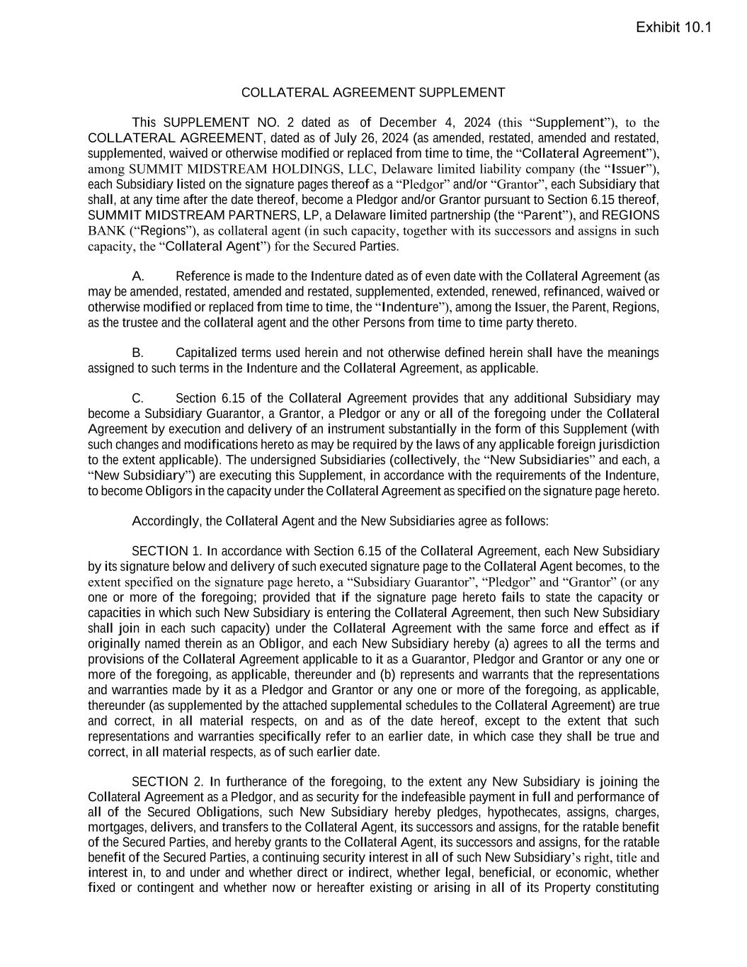 COLLATERAL AGREEMENT SUPPLEMENT This SUPPLEMENT NO. 2 dated as of December 4, 2024 (this “Supplement”), to the COLLATERAL AGREEMENT, dated as of July 26, 2024 (as amended, restated, amended and restated, supplemented, waived or otherwise modified or replaced from time to time, the “Collateral Agreement”), among SUMMIT MIDSTREAM HOLDINGS, LLC, Delaware limited liability company (the “Issuer”), each Subsidiary listed on the signature pages thereof as a “Pledgor” and/or “Grantor”, each Subsidiary that shall, at any time after the date thereof, become a Pledgor and/or Grantor pursuant to Section 6.15 thereof, SUMMIT MIDSTREAM PARTNERS, LP, a Delaware limited partnership (the “Parent”), and REGIONS BANK (“Regions”), as collateral agent (in such capacity, together with its successors and assigns in such capacity, the “Collateral Agent”) for the Secured Parties. A. Reference is made to the Indenture dated as of even date with the Collateral Agreement (as may be amended, restated, amended and restated, supplemented, extended, renewed, refinanced, waived or otherwise modified or replaced from time to time, the “Indenture”), among the Issuer, the Parent, Regions, as the trustee and the collateral agent and the other Persons from time to time party thereto. B. Capitalized terms used herein and not otherwise defined herein shall have the meanings assigned to such terms in the Indenture and the Collateral Agreement, as applicable. C. Section 6.15 of the Collateral Agreement provides that any additional Subsidiary may become a Subsidiary Guarantor, a Grantor, a Pledgor or any or all of the foregoing under the Collateral Agreement by execution and delivery of an instrument substantially in the form of this Supplement (with such changes and modifications hereto as may be required by the laws of any applicable foreign jurisdiction to the extent applicable). The undersigned Subsidiaries (collectively, the “New Subsidiaries” and each, a “New Subsidiary”) are executing this Supplement, in accordance with the requirements of the Indenture, to become Obligors in the capacity under the Collateral Agreement as specified on the signature page hereto. Accordingly, the Collateral Agent and the New Subsidiaries agree as follows: SECTION 1. In accordance with Section 6.15 of the Collateral Agreement, each New Subsidiary by its signature below and delivery of such executed signature page to the Collateral Agent becomes, to the extent specified on the signature page hereto, a “Subsidiary Guarantor”, “Pledgor” and “Grantor” (or any one or more of the foregoing; provided that if the signature page hereto fails to state the capacity or capacities in which such New Subsidiary is entering the Collateral Agreement, then such New Subsidiary shall join in each such capacity) under the Collateral Agreement with the same force and effect as if originally named therein as an Obligor, and each New Subsidiary hereby (a) agrees to all the terms and provisions of the Collateral Agreement applicable to it as a Guarantor, Pledgor and Grantor or any one or more of the foregoing, as applicable, thereunder and (b) represents and warrants that the representations and warranties made by it as a Pledgor and Grantor or any one or more of the foregoing, as applicable, thereunder (as supplemented by the attached supplemental schedules to the Collateral Agreement) are true and correct, in all material respects, on and as of the date hereof, except to the extent that such representations and warranties specifically refer to an earlier date, in which case they shall be true and correct, in all material respects, as of such earlier date. SECTION 2. In furtherance of the foregoing, to the extent any New Subsidiary is joining the Collateral Agreement as a Pledgor, and as security for the indefeasible payment in full and performance of all of the Secured Obligations, such New Subsidiary hereby pledges, hypothecates, assigns, charges, mortgages, delivers, and transfers to the Collateral Agent, its successors and assigns, for the ratable benefit of the Secured Parties, and hereby grants to the Collateral Agent, its successors and assigns, for the ratable benefit of the Secured Parties, a continuing security interest in all of such New Subsidiary’s right, title and interest in, to and under and whether direct or indirect, whether legal, beneficial, or economic, whether fixed or contingent and whether now or hereafter existing or arising in all of its Property constituting Exhibit 10.1