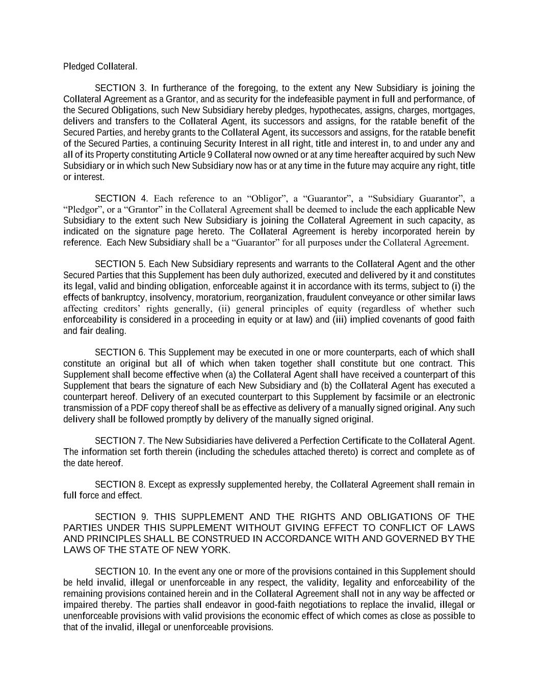 Pledged Collateral. SECTION 3. In furtherance of the foregoing, to the extent any New Subsidiary is joining the Collateral Agreement as a Grantor, and as security for the indefeasible payment in full and performance, of the Secured Obligations, such New Subsidiary hereby pledges, hypothecates, assigns, charges, mortgages, delivers and transfers to the Collateral Agent, its successors and assigns, for the ratable benefit of the Secured Parties, and hereby grants to the Collateral Agent, its successors and assigns, for the ratable benefit of the Secured Parties, a continuing Security Interest in all right, title and interest in, to and under any and all of its Property constituting Article 9 Collateral now owned or at any time hereafter acquired by such New Subsidiary or in which such New Subsidiary now has or at any time in the future may acquire any right, title or interest. SECTION 4. Each reference to an “Obligor”, a “Guarantor”, a “Subsidiary Guarantor”, a “Pledgor”, or a “Grantor” in the Collateral Agreement shall be deemed to include the each applicable New Subsidiary to the extent such New Subsidiary is joining the Collateral Agreement in such capacity, as indicated on the signature page hereto. The Collateral Agreement is hereby incorporated herein by reference. Each New Subsidiary shall be a “Guarantor” for all purposes under the Collateral Agreement. SECTION 5. Each New Subsidiary represents and warrants to the Collateral Agent and the other Secured Parties that this Supplement has been duly authorized, executed and delivered by it and constitutes its legal, valid and binding obligation, enforceable against it in accordance with its terms, subject to (i) the effects of bankruptcy, insolvency, moratorium, reorganization, fraudulent conveyance or other similar laws affecting creditors’ rights generally, (ii) general principles of equity (regardless of whether such enforceability is considered in a proceeding in equity or at law) and (iii) implied covenants of good faith and fair dealing. SECTION 6. This Supplement may be executed in one or more counterparts, each of which shall constitute an original but all of which when taken together shall constitute but one contract. This Supplement shall become effective when (a) the Collateral Agent shall have received a counterpart of this Supplement that bears the signature of each New Subsidiary and (b) the Collateral Agent has executed a counterpart hereof. Delivery of an executed counterpart to this Supplement by facsimile or an electronic transmission of a PDF copy thereof shall be as effective as delivery of a manually signed original. Any such delivery shall be followed promptly by delivery of the manually signed original. SECTION 7. The New Subsidiaries have delivered a Perfection Certificate to the Collateral Agent. The information set forth therein (including the schedules attached thereto) is correct and complete as of the date hereof. SECTION 8. Except as expressly supplemented hereby, the Collateral Agreement shall remain in full force and effect. SECTION 9. THIS SUPPLEMENT AND THE RIGHTS AND OBLIGATIONS OF THE PARTIES UNDER THIS SUPPLEMENT WITHOUT GIVING EFFECT TO CONFLICT OF LAWS AND PRINCIPLES SHALL BE CONSTRUED IN ACCORDANCE WITH AND GOVERNED BY THE LAWS OF THE STATE OF NEW YORK. SECTION 10. In the event any one or more of the provisions contained in this Supplement should be held invalid, illegal or unenforceable in any respect, the validity, legality and enforceability of the remaining provisions contained herein and in the Collateral Agreement shall not in any way be affected or impaired thereby. The parties shall endeavor in good-faith negotiations to replace the invalid, illegal or unenforceable provisions with valid provisions the economic effect of which comes as close as possible to that of the invalid, illegal or unenforceable provisions.