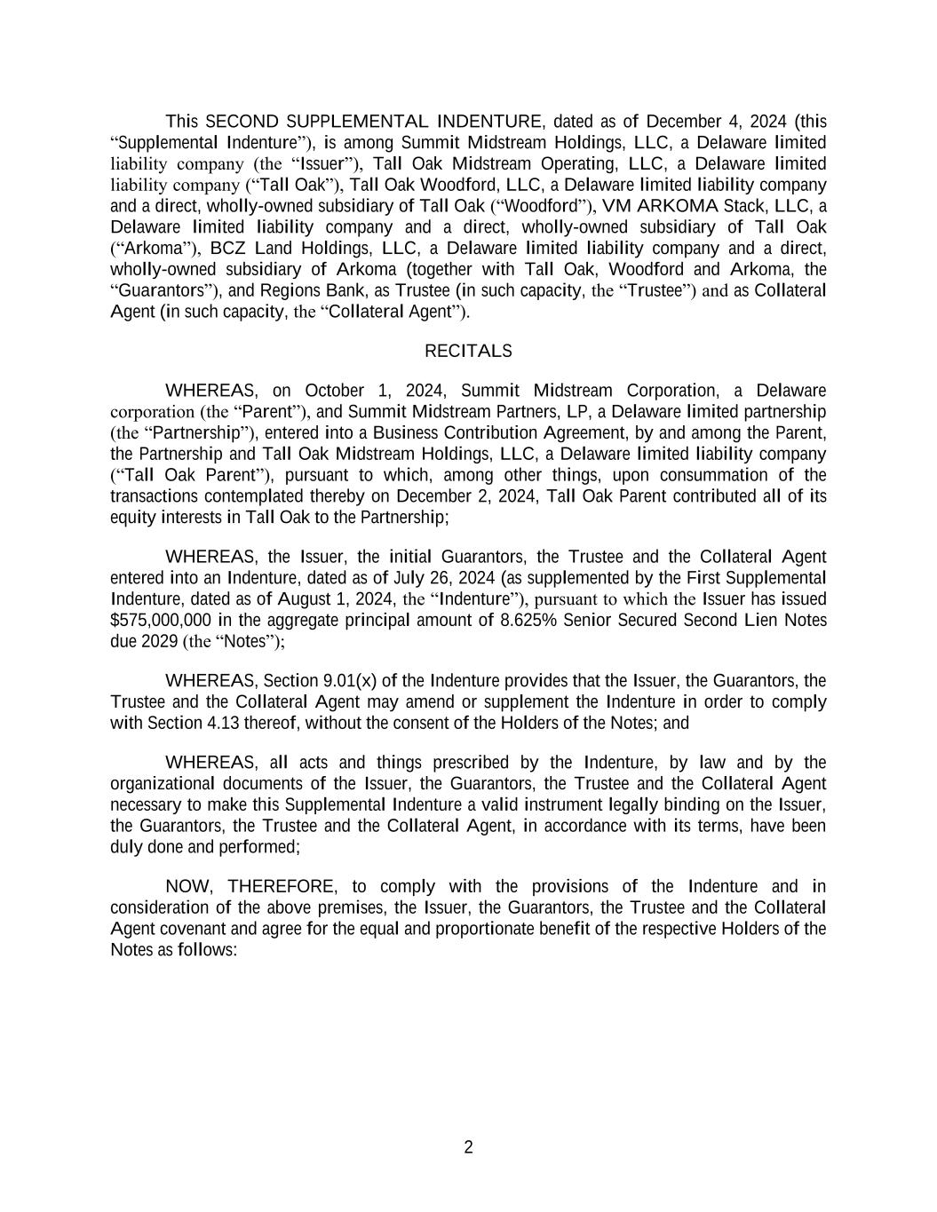 2 This SECOND SUPPLEMENTAL INDENTURE, dated as of December 4, 2024 (this “Supplemental Indenture”), is among Summit Midstream Holdings, LLC, a Delaware limited liability company (the “Issuer”), Tall Oak Midstream Operating, LLC, a Delaware limited liability company (“Tall Oak”), Tall Oak Woodford, LLC, a Delaware limited liability company and a direct, wholly-owned subsidiary of Tall Oak (“Woodford”), VM ARKOMA Stack, LLC, a Delaware limited liability company and a direct, wholly-owned subsidiary of Tall Oak (“Arkoma”), BCZ Land Holdings, LLC, a Delaware limited liability company and a direct, wholly-owned subsidiary of Arkoma (together with Tall Oak, Woodford and Arkoma, the “Guarantors”), and Regions Bank, as Trustee (in such capacity, the “Trustee”) and as Collateral Agent (in such capacity, the “Collateral Agent”). RECITALS WHEREAS, on October 1, 2024, Summit Midstream Corporation, a Delaware corporation (the “Parent”), and Summit Midstream Partners, LP, a Delaware limited partnership (the “Partnership”), entered into a Business Contribution Agreement, by and among the Parent, the Partnership and Tall Oak Midstream Holdings, LLC, a Delaware limited liability company (“Tall Oak Parent”), pursuant to which, among other things, upon consummation of the transactions contemplated thereby on December 2, 2024, Tall Oak Parent contributed all of its equity interests in Tall Oak to the Partnership; WHEREAS, the Issuer, the initial Guarantors, the Trustee and the Collateral Agent entered into an Indenture, dated as of July 26, 2024 (as supplemented by the First Supplemental Indenture, dated as of August 1, 2024, the “Indenture”), pursuant to which the Issuer has issued $575,000,000 in the aggregate principal amount of 8.625% Senior Secured Second Lien Notes due 2029 (the “Notes”); WHEREAS, Section 9.01(x) of the Indenture provides that the Issuer, the Guarantors, the Trustee and the Collateral Agent may amend or supplement the Indenture in order to comply with Section 4.13 thereof, without the consent of the Holders of the Notes; and WHEREAS, all acts and things prescribed by the Indenture, by law and by the organizational documents of the Issuer, the Guarantors, the Trustee and the Collateral Agent necessary to make this Supplemental Indenture a valid instrument legally binding on the Issuer, the Guarantors, the Trustee and the Collateral Agent, in accordance with its terms, have been duly done and performed; NOW, THEREFORE, to comply with the provisions of the Indenture and in consideration of the above premises, the Issuer, the Guarantors, the Trustee and the Collateral Agent covenant and agree for the equal and proportionate benefit of the respective Holders of the Notes as follows: