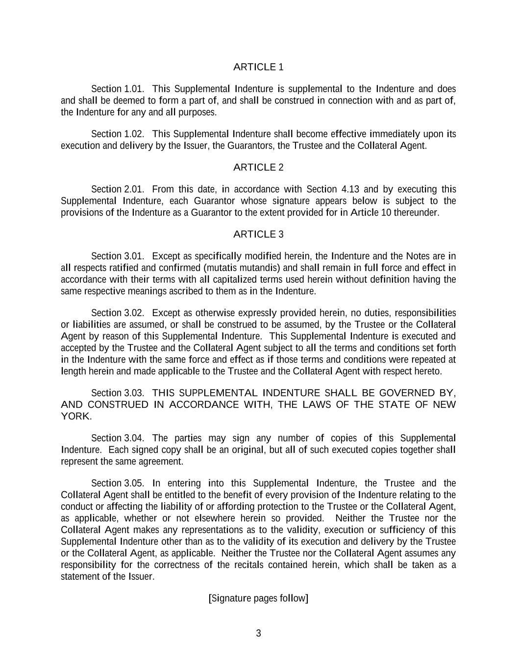 3 ARTICLE 1 Section 1.01. This Supplemental Indenture is supplemental to the Indenture and does and shall be deemed to form a part of, and shall be construed in connection with and as part of, the Indenture for any and all purposes. Section 1.02. This Supplemental Indenture shall become effective immediately upon its execution and delivery by the Issuer, the Guarantors, the Trustee and the Collateral Agent. ARTICLE 2 Section 2.01. From this date, in accordance with Section 4.13 and by executing this Supplemental Indenture, each Guarantor whose signature appears below is subject to the provisions of the Indenture as a Guarantor to the extent provided for in Article 10 thereunder. ARTICLE 3 Section 3.01. Except as specifically modified herein, the Indenture and the Notes are in all respects ratified and confirmed (mutatis mutandis) and shall remain in full force and effect in accordance with their terms with all capitalized terms used herein without definition having the same respective meanings ascribed to them as in the Indenture. Section 3.02. Except as otherwise expressly provided herein, no duties, responsibilities or liabilities are assumed, or shall be construed to be assumed, by the Trustee or the Collateral Agent by reason of this Supplemental Indenture. This Supplemental Indenture is executed and accepted by the Trustee and the Collateral Agent subject to all the terms and conditions set forth in the Indenture with the same force and effect as if those terms and conditions were repeated at length herein and made applicable to the Trustee and the Collateral Agent with respect hereto. Section 3.03. THIS SUPPLEMENTAL INDENTURE SHALL BE GOVERNED BY, AND CONSTRUED IN ACCORDANCE WITH, THE LAWS OF THE STATE OF NEW YORK. Section 3.04. The parties may sign any number of copies of this Supplemental Indenture. Each signed copy shall be an original, but all of such executed copies together shall represent the same agreement. Section 3.05. In entering into this Supplemental Indenture, the Trustee and the Collateral Agent shall be entitled to the benefit of every provision of the Indenture relating to the conduct or affecting the liability of or affording protection to the Trustee or the Collateral Agent, as applicable, whether or not elsewhere herein so provided. Neither the Trustee nor the Collateral Agent makes any representations as to the validity, execution or sufficiency of this Supplemental Indenture other than as to the validity of its execution and delivery by the Trustee or the Collateral Agent, as applicable. Neither the Trustee nor the Collateral Agent assumes any responsibility for the correctness of the recitals contained herein, which shall be taken as a statement of the Issuer. [Signature pages follow]