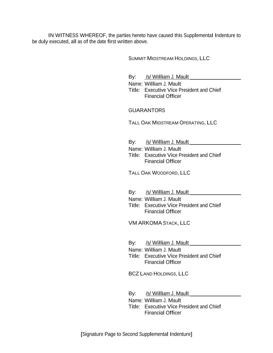 [Signature Page to Second Supplemental Indenture] IN WITNESS WHEREOF, the parties hereto have caused this Supplemental Indenture to be duly executed, all as of the date first written above. SUMMIT MIDSTREAM HOLDINGS, LLC By: /s/ William J. Mault ___________________ Name: William J. Mault Title: Executive Vice President and Chief Financial Officer GUARANTORS TALL OAK MIDSTREAM OPERATING, LLC By: /s/ William J. Mault ___________________ Name: William J. Mault Title: Executive Vice President and Chief Financial Officer TALL OAK WOODFORD, LLC By: /s/ William J. Mault ___________________ Name: William J. Mault Title: Executive Vice President and Chief Financial Officer VM ARKOMA STACK, LLC By: /s/ William J. Mault ___________________ Name: William J. Mault Title: Executive Vice President and Chief Financial Officer BCZ LAND HOLDINGS, LLC By: /s/ William J. Mault ___________________ Name: William J. Mault Title: Executive Vice President and Chief Financial Officer