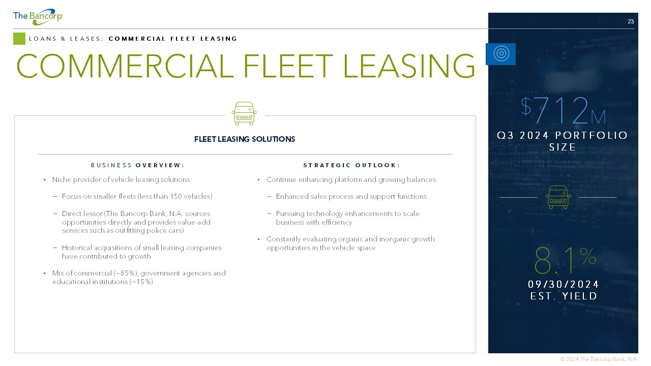 TYPE DISTRIBUTION • Diverse product mix • Commercial mortgage and construction are generally originated with 50% - 60% LTV’s GEOGRAPHIC DISTRIBUTION • Diverse geographic mix • Largest concentration in California representing 24% of total PORTFOLIO ATTRIBUTES 23 LOANS & LEASES: COMMERCIAL FLEET LEASING COMMERCIAL FLEET LEASING BUSINESS OVERVIEW: • Niche provider of vehicle leasing solutions − Focus on smaller fleets (less than 150 vehicles) − Direct lessor (The Bancorp Bank, N.A. sources opportunities directly and provides value - add services such as outfitting police cars) − Historical acquisitions of small leasing companies have contributed to growth • Mix of commercial (~85%), government agencies and educational institutions (~15%) STRATEGIC OUTLOOK: • Continue enhancing platform and growing balances − Enhanced sales process and support functions − Pursuing technology enhancements to scale business with efficiency • Constantly evaluating organic and inorganic growth opportunities in the vehicle space FLEET LEASING SOLUTIONS $ 712 M Q3 2024 PORTFOLIO SIZE 8.1 % 09/30/2024 EST.