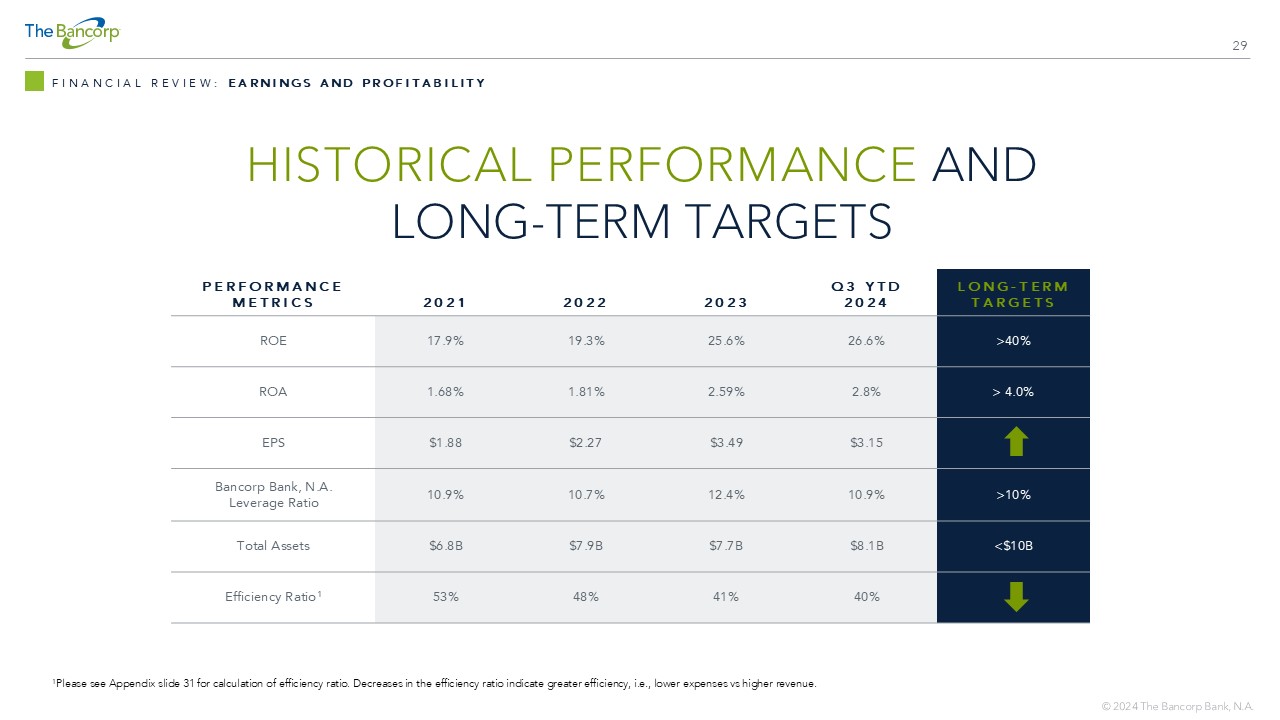 29 HISTORICAL PERFORMANCE AND LONG - TERM TARGETS FINANCIAL REVIEW: EARNINGS AND PROFITABILITY LONG - TERM TARGETS Q3 YTD 2024 2023 2022 2021 PERFORMANCE METRICS >40% 26.6% 25.6% 19.3% 17.9% ROE > 4.0% 2.8% 2.59% 1.81% 1.68% ROA $3.15 $3.49 $2.27 $1.88 EPS >10% 10.9% 12.4% 10.7% 10.9% Bancorp Bank, N.A. Leverage Ratio <$10B $8.1B $7.7B $7.9B $6.8B Total Assets 40% 41% 48% 53% Efficiency Ratio 1 1 Please see Appendix slide 31 for calculation of efficiency ratio. Decreases in the efficiency ratio indicate greater efficien cy, i.e., lower expenses vs higher revenue.