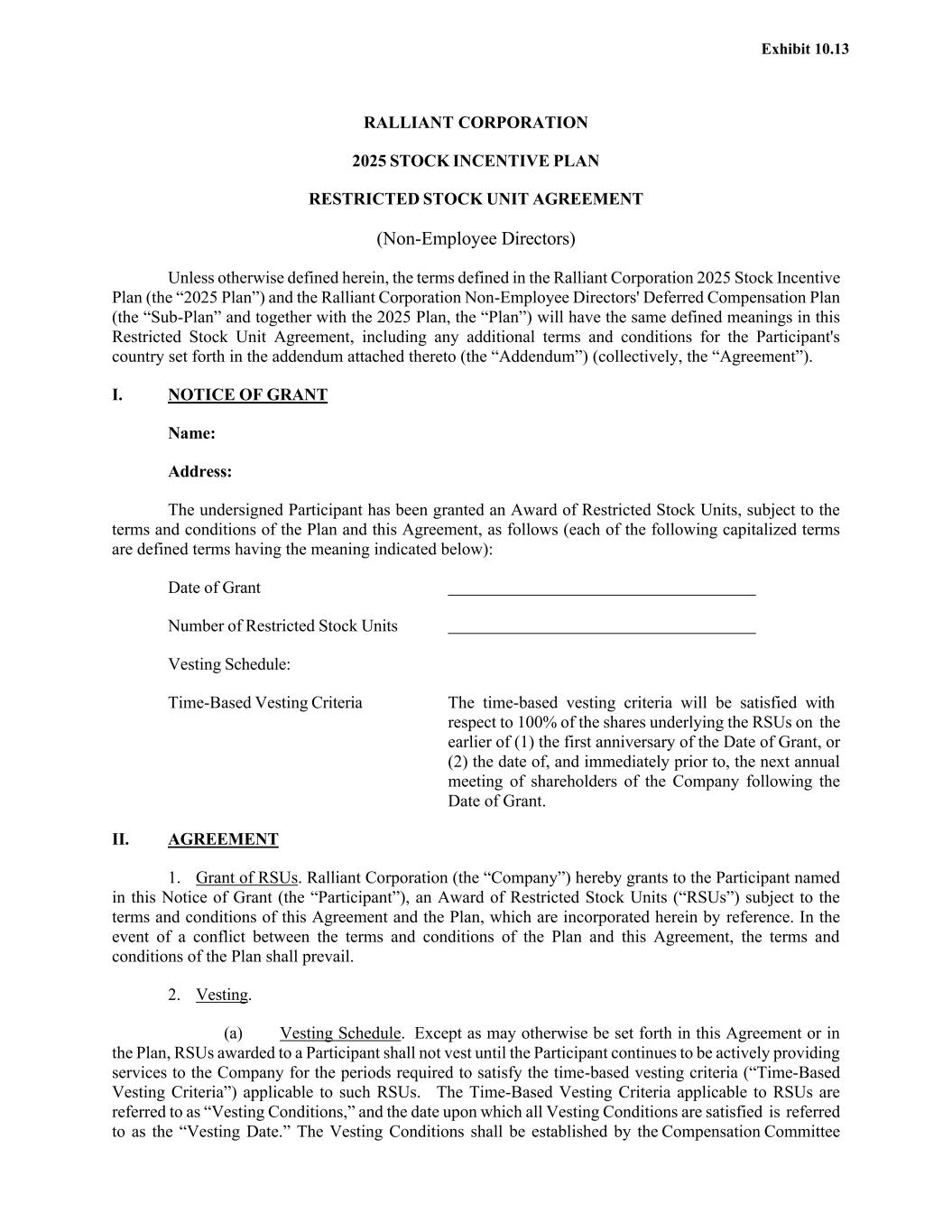Exhibit 10.13 RALLIANT CORPORATION 2025 STOCK INCENTIVE PLAN RESTRICTED STOCK UNIT AGREEMENT (Non-Employee Directors) Unless otherwise defined herein, the terms defined in the Ralliant Corporation 2025 Stock Incentive Plan (the “2025 Plan”) and the Ralliant Corporation Non-Employee Directors' Deferred Compensation Plan (the “Sub-Plan” and together with the 2025 Plan, the “Plan”) will have the same defined meanings in this Restricted Stock Unit Agreement, including any additional terms and conditions for the Participant's country set forth in the addendum attached thereto (the “Addendum”) (collectively, the “Agreement”). I. NOTICE OF GRANT Name: Address: The undersigned Participant has been granted an Award of Restricted Stock Units, subject to the terms and conditions of the Plan and this Agreement, as follows (each of the following capitalized terms are defined terms having the meaning indicated below): Date of Grant Number of Restricted Stock Units Vesting Schedule: Time-Based Vesting Criteria The time-based vesting criteria will be satisfied with respect to 100% of the shares underlying the RSUs on the earlier of (1) the first anniversary of the Date of Grant, or (2) the date of, and immediately prior to, the next annual meeting of shareholders of the Company following the Date of Grant. II. AGREEMENT 1. Grant of RSUs. Ralliant Corporation (the “Company”) hereby grants to the Participant named in this Notice of Grant (the “Participant”), an Award of Restricted Stock Units (“RSUs”) subject to the terms and conditions of this Agreement and the Plan, which are incorporated herein by reference. In the event of a conflict between the terms and conditions of the Plan and this Agreement, the terms and conditions of the Plan shall prevail. 2. Vesting. (a) Vesting Schedule. Except as may otherwise be set forth in this Agreement or in the Plan, RSUs awarded to a Participant shall not vest until the Participant continues to be actively providing services to the Company for the periods required to satisfy the time-based vesting criteria (“Time-Based Vesting Criteria”) applicable to such RSUs. The Time-Based Vesting Criteria applicable to RSUs are referred to as “Vesting Conditions,” and the date upon which all Vesting Conditions are satisfied is referred to as the “Vesting Date.” The Vesting Conditions shall be established by the Compensation Committee