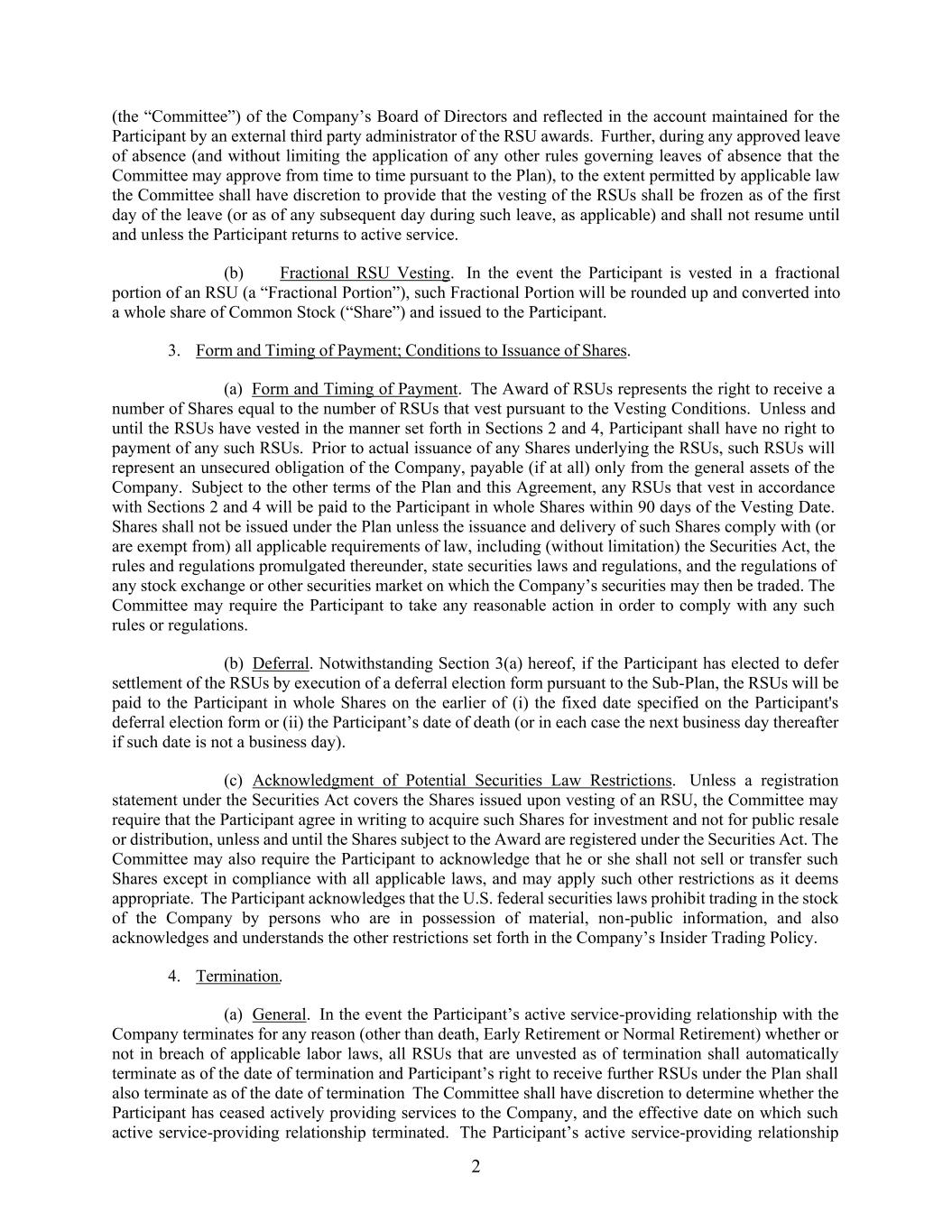2 (the “Committee”) of the Company’s Board of Directors and reflected in the account maintained for the Participant by an external third party administrator of the RSU awards. Further, during any approved leave of absence (and without limiting the application of any other rules governing leaves of absence that the Committee may approve from time to time pursuant to the Plan), to the extent permitted by applicable law the Committee shall have discretion to provide that the vesting of the RSUs shall be frozen as of the first day of the leave (or as of any subsequent day during such leave, as applicable) and shall not resume until and unless the Participant returns to active service. (b) Fractional RSU Vesting. In the event the Participant is vested in a fractional portion of an RSU (a “Fractional Portion”), such Fractional Portion will be rounded up and converted into a whole share of Common Stock (“Share”) and issued to the Participant. 3. Form and Timing of Payment; Conditions to Issuance of Shares. (a) Form and Timing of Payment. The Award of RSUs represents the right to receive a number of Shares equal to the number of RSUs that vest pursuant to the Vesting Conditions. Unless and until the RSUs have vested in the manner set forth in Sections 2 and 4, Participant shall have no right to payment of any such RSUs. Prior to actual issuance of any Shares underlying the RSUs, such RSUs will represent an unsecured obligation of the Company, payable (if at all) only from the general assets of the Company. Subject to the other terms of the Plan and this Agreement, any RSUs that vest in accordance with Sections 2 and 4 will be paid to the Participant in whole Shares within 90 days of the Vesting Date. Shares shall not be issued under the Plan unless the issuance and delivery of such Shares comply with (or are exempt from) all applicable requirements of law, including (without limitation) the Securities Act, the rules and regulations promulgated thereunder, state securities laws and regulations, and the regulations of any stock exchange or other securities market on which the Company’s securities may then be traded. The Committee may require the Participant to take any reasonable action in order to comply with any such rules or regulations. (b) Deferral. Notwithstanding Section 3(a) hereof, if the Participant has elected to defer settlement of the RSUs by execution of a deferral election form pursuant to the Sub-Plan, the RSUs will be paid to the Participant in whole Shares on the earlier of (i) the fixed date specified on the Participant's deferral election form or (ii) the Participant’s date of death (or in each case the next business day thereafter if such date is not a business day). (c) Acknowledgment of Potential Securities Law Restrictions. Unless a registration statement under the Securities Act covers the Shares issued upon vesting of an RSU, the Committee may require that the Participant agree in writing to acquire such Shares for investment and not for public resale or distribution, unless and until the Shares subject to the Award are registered under the Securities Act. The Committee may also require the Participant to acknowledge that he or she shall not sell or transfer such Shares except in compliance with all applicable laws, and may apply such other restrictions as it deems appropriate. The Participant acknowledges that the U.S. federal securities laws prohibit trading in the stock of the Company by persons who are in possession of material, non-public information, and also acknowledges and understands the other restrictions set forth in the Company’s Insider Trading Policy. 4. Termination. (a) General. In the event the Participant’s active service-providing relationship with the Company terminates for any reason (other than death, Early Retirement or Normal Retirement) whether or not in breach of applicable labor laws, all RSUs that are unvested as of termination shall automatically terminate as of the date of termination and Participant’s right to receive further RSUs under the Plan shall also terminate as of the date of termination The Committee shall have discretion to determine whether the Participant has ceased actively providing services to the Company, and the effective date on which such active service-providing relationship terminated. The Participant’s active service-providing relationship
