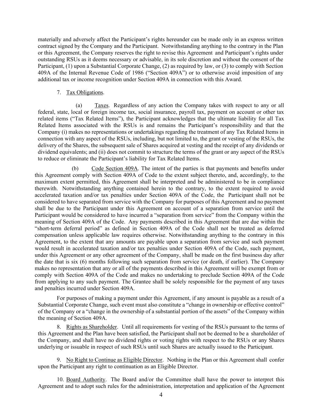 4 materially and adversely affect the Participant’s rights hereunder can be made only in an express written contract signed by the Company and the Participant. Notwithstanding anything to the contrary in the Plan or this Agreement, the Company reserves the right to revise this Agreement and Participant’s rights under outstanding RSUs as it deems necessary or advisable, in its sole discretion and without the consent of the Participant, (1) upon a Substantial Corporate Change, (2) as required by law, or (3) to comply with Section 409A of the Internal Revenue Code of 1986 (“Section 409A”) or to otherwise avoid imposition of any additional tax or income recognition under Section 409A in connection with this Award. 7. Tax Obligations. (a) Taxes. Regardless of any action the Company takes with respect to any or all federal, state, local or foreign income tax, social insurance, payroll tax, payment on account or other tax related items (“Tax Related Items”), the Participant acknowledges that the ultimate liability for all Tax Related Items associated with the RSUs is and remains the Participant’s responsibility and that the Company (i) makes no representations or undertakings regarding the treatment of any Tax Related Items in connection with any aspect of the RSUs, including, but not limited to, the grant or vesting of the RSUs, the delivery of the Shares, the subsequent sale of Shares acquired at vesting and the receipt of any dividends or dividend equivalents; and (ii) does not commit to structure the terms of the grant or any aspect of the RSUs to reduce or eliminate the Participant’s liability for Tax Related Items. (b) Code Section 409A. The intent of the parties is that payments and benefits under this Agreement comply with Section 409A of Code to the extent subject thereto, and, accordingly, to the maximum extent permitted, this Agreement shall be interpreted and be administered to be in compliance therewith. Notwithstanding anything contained herein to the contrary, to the extent required to avoid accelerated taxation and/or tax penalties under Section 409A of the Code, the Participant shall not be considered to have separated from service with the Company for purposes of this Agreement and no payment shall be due to the Participant under this Agreement on account of a separation from service until the Participant would be considered to have incurred a “separation from service” from the Company within the meaning of Section 409A of the Code. Any payments described in this Agreement that are due within the “short-term deferral period” as defined in Section 409A of the Code shall not be treated as deferred compensation unless applicable law requires otherwise. Notwithstanding anything to the contrary in this Agreement, to the extent that any amounts are payable upon a separation from service and such payment would result in accelerated taxation and/or tax penalties under Section 409A of the Code, such payment, under this Agreement or any other agreement of the Company, shall be made on the first business day after the date that is six (6) months following such separation from service (or death, if earlier). The Company makes no representation that any or all of the payments described in this Agreement will be exempt from or comply with Section 409A of the Code and makes no undertaking to preclude Section 409A of the Code from applying to any such payment. The Grantee shall be solely responsible for the payment of any taxes and penalties incurred under Section 409A. For purposes of making a payment under this Agreement, if any amount is payable as a result of a Substantial Corporate Change, such event must also constitute a “change in ownership or effective control” of the Company or a “change in the ownership of a substantial portion of the assets” of the Company within the meaning of Section 409A. 8. Rights as Shareholder. Until all requirements for vesting of the RSUs pursuant to the terms of this Agreement and the Plan have been satisfied, the Participant shall not be deemed to be a shareholder of the Company, and shall have no dividend rights or voting rights with respect to the RSUs or any Shares underlying or issuable in respect of such RSUs until such Shares are actually issued to the Participant. 9. No Right to Continue as Eligible Director. Nothing in the Plan or this Agreement shall confer upon the Participant any right to continuation as an Eligible Director. 10. Board Authority. The Board and/or the Committee shall have the power to interpret this Agreement and to adopt such rules for the administration, interpretation and application of the Agreement