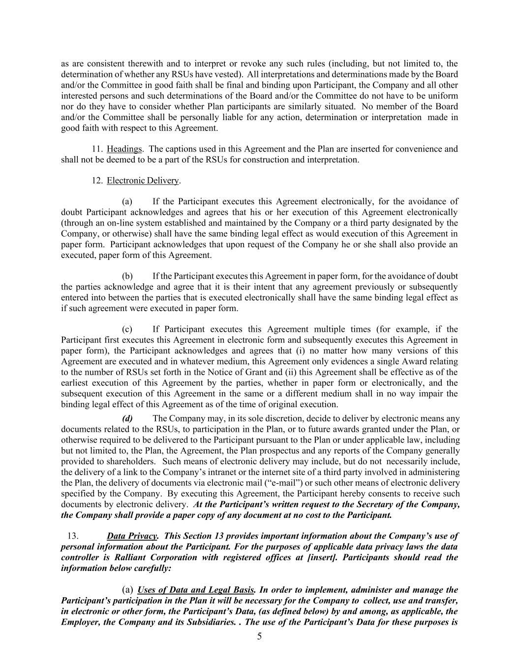 5 as are consistent therewith and to interpret or revoke any such rules (including, but not limited to, the determination of whether any RSUs have vested). All interpretations and determinations made by the Board and/or the Committee in good faith shall be final and binding upon Participant, the Company and all other interested persons and such determinations of the Board and/or the Committee do not have to be uniform nor do they have to consider whether Plan participants are similarly situated. No member of the Board and/or the Committee shall be personally liable for any action, determination or interpretation made in good faith with respect to this Agreement. 11. Headings. The captions used in this Agreement and the Plan are inserted for convenience and shall not be deemed to be a part of the RSUs for construction and interpretation. 12. Electronic Delivery. (a) If the Participant executes this Agreement electronically, for the avoidance of doubt Participant acknowledges and agrees that his or her execution of this Agreement electronically (through an on-line system established and maintained by the Company or a third party designated by the Company, or otherwise) shall have the same binding legal effect as would execution of this Agreement in paper form. Participant acknowledges that upon request of the Company he or she shall also provide an executed, paper form of this Agreement. (b) If the Participant executes this Agreement in paper form, for the avoidance of doubt the parties acknowledge and agree that it is their intent that any agreement previously or subsequently entered into between the parties that is executed electronically shall have the same binding legal effect as if such agreement were executed in paper form. (c) If Participant executes this Agreement multiple times (for example, if the Participant first executes this Agreement in electronic form and subsequently executes this Agreement in paper form), the Participant acknowledges and agrees that (i) no matter how many versions of this Agreement are executed and in whatever medium, this Agreement only evidences a single Award relating to the number of RSUs set forth in the Notice of Grant and (ii) this Agreement shall be effective as of the earliest execution of this Agreement by the parties, whether in paper form or electronically, and the subsequent execution of this Agreement in the same or a different medium shall in no way impair the binding legal effect of this Agreement as of the time of original execution. (d) The Company may, in its sole discretion, decide to deliver by electronic means any documents related to the RSUs, to participation in the Plan, or to future awards granted under the Plan, or otherwise required to be delivered to the Participant pursuant to the Plan or under applicable law, including but not limited to, the Plan, the Agreement, the Plan prospectus and any reports of the Company generally provided to shareholders. Such means of electronic delivery may include, but do not necessarily include, the delivery of a link to the Company’s intranet or the internet site of a third party involved in administering the Plan, the delivery of documents via electronic mail (“e-mail”) or such other means of electronic delivery specified by the Company. By executing this Agreement, the Participant hereby consents to receive such documents by electronic delivery. At the Participant’s written request to the Secretary of the Company, the Company shall provide a paper copy of any document at no cost to the Participant. 13. Data Privacy. This Section 13 provides important information about the Company’s use of personal information about the Participant. For the purposes of applicable data privacy laws the data controller is Ralliant Corporation with registered offices at [insert]. Participants should read the information below carefully: (a) Uses of Data and Legal Basis. In order to implement, administer and manage the Participant’s participation in the Plan it will be necessary for the Company to collect, use and transfer, in electronic or other form, the Participant’s Data, (as defined below) by and among, as applicable, the Employer, the Company and its Subsidiaries. . The use of the Participant’s Data for these purposes is