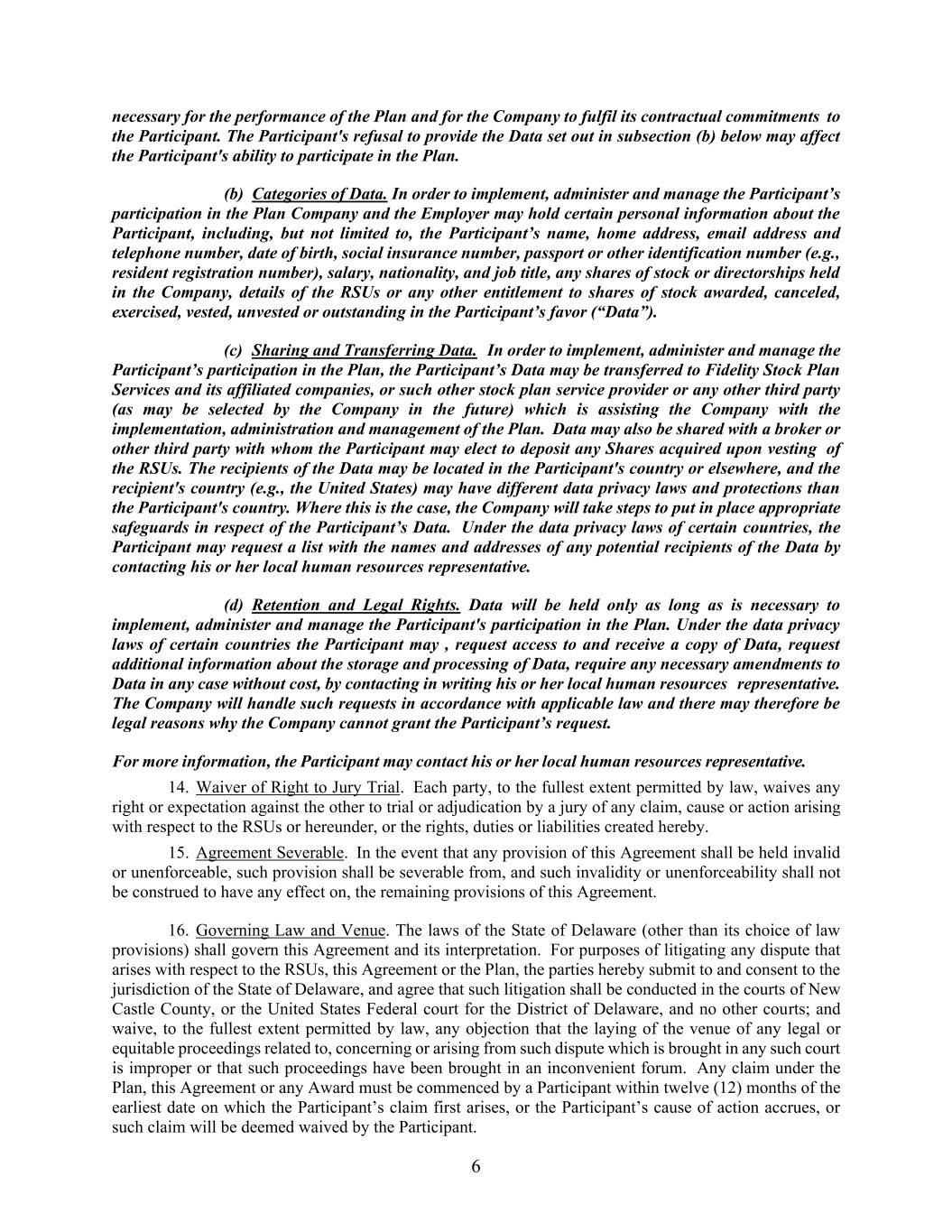 6 necessary for the performance of the Plan and for the Company to fulfil its contractual commitments to the Participant. The Participant's refusal to provide the Data set out in subsection (b) below may affect the Participant's ability to participate in the Plan. (b) Categories of Data. In order to implement, administer and manage the Participant’s participation in the Plan Company and the Employer may hold certain personal information about the Participant, including, but not limited to, the Participant’s name, home address, email address and telephone number, date of birth, social insurance number, passport or other identification number (e.g., resident registration number), salary, nationality, and job title, any shares of stock or directorships held in the Company, details of the RSUs or any other entitlement to shares of stock awarded, canceled, exercised, vested, unvested or outstanding in the Participant’s favor (“Data”). (c) Sharing and Transferring Data. In order to implement, administer and manage the Participant’s participation in the Plan, the Participant’s Data may be transferred to Fidelity Stock Plan Services and its affiliated companies, or such other stock plan service provider or any other third party (as may be selected by the Company in the future) which is assisting the Company with the implementation, administration and management of the Plan. Data may also be shared with a broker or other third party with whom the Participant may elect to deposit any Shares acquired upon vesting of the RSUs. The recipients of the Data may be located in the Participant's country or elsewhere, and the recipient's country (e.g., the United States) may have different data privacy laws and protections than the Participant's country. Where this is the case, the Company will take steps to put in place appropriate safeguards in respect of the Participant’s Data. Under the data privacy laws of certain countries, the Participant may request a list with the names and addresses of any potential recipients of the Data by contacting his or her local human resources representative. (d) Retention and Legal Rights. Data will be held only as long as is necessary to implement, administer and manage the Participant's participation in the Plan. Under the data privacy laws of certain countries the Participant may , request access to and receive a copy of Data, request additional information about the storage and processing of Data, require any necessary amendments to Data in any case without cost, by contacting in writing his or her local human resources representative. The Company will handle such requests in accordance with applicable law and there may therefore be legal reasons why the Company cannot grant the Participant’s request. For more information, the Participant may contact his or her local human resources representative. 14. Waiver of Right to Jury Trial. Each party, to the fullest extent permitted by law, waives any right or expectation against the other to trial or adjudication by a jury of any claim, cause or action arising with respect to the RSUs or hereunder, or the rights, duties or liabilities created hereby. 15. Agreement Severable. In the event that any provision of this Agreement shall be held invalid or unenforceable, such provision shall be severable from, and such invalidity or unenforceability shall not be construed to have any effect on, the remaining provisions of this Agreement. 16. Governing Law and Venue. The laws of the State of Delaware (other than its choice of law provisions) shall govern this Agreement and its interpretation. For purposes of litigating any dispute that arises with respect to the RSUs, this Agreement or the Plan, the parties hereby submit to and consent to the jurisdiction of the State of Delaware, and agree that such litigation shall be conducted in the courts of New Castle County, or the United States Federal court for the District of Delaware, and no other courts; and waive, to the fullest extent permitted by law, any objection that the laying of the venue of any legal or equitable proceedings related to, concerning or arising from such dispute which is brought in any such court is improper or that such proceedings have been brought in an inconvenient forum. Any claim under the Plan, this Agreement or any Award must be commenced by a Participant within twelve (12) months of the earliest date on which the Participant’s claim first arises, or the Participant’s cause of action accrues, or such claim will be deemed waived by the Participant.