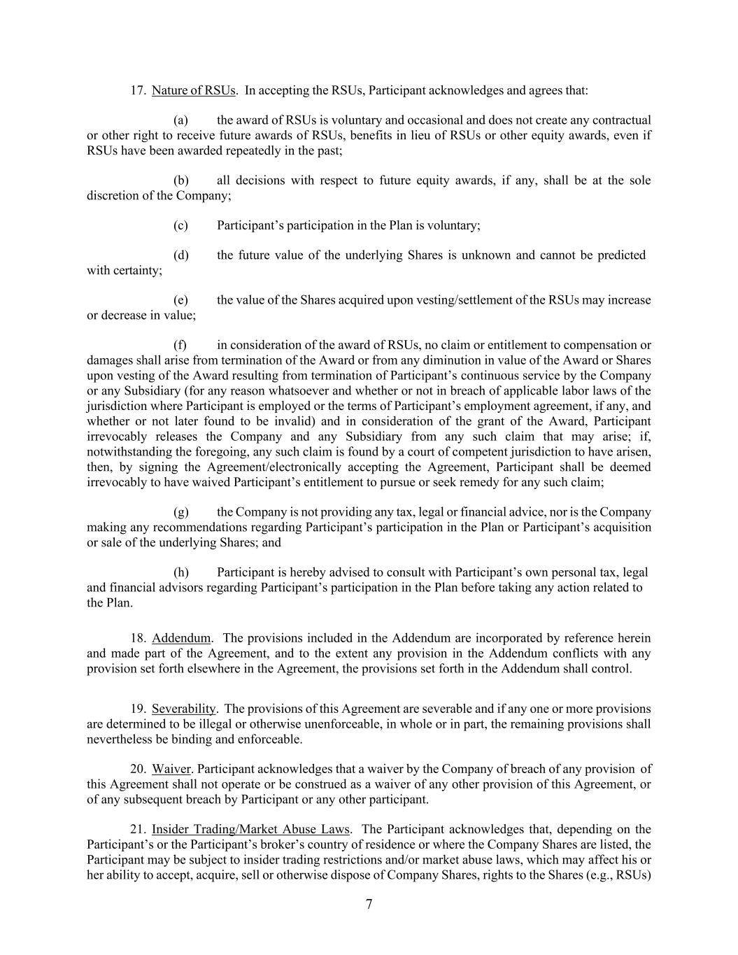7 17. Nature of RSUs. In accepting the RSUs, Participant acknowledges and agrees that: (a) the award of RSUs is voluntary and occasional and does not create any contractual or other right to receive future awards of RSUs, benefits in lieu of RSUs or other equity awards, even if RSUs have been awarded repeatedly in the past; (b) all decisions with respect to future equity awards, if any, shall be at the sole discretion of the Company; (c) Participant’s participation in the Plan is voluntary; (d) the future value of the underlying Shares is unknown and cannot be predicted with certainty; (e) the value of the Shares acquired upon vesting/settlement of the RSUs may increase or decrease in value; (f) in consideration of the award of RSUs, no claim or entitlement to compensation or damages shall arise from termination of the Award or from any diminution in value of the Award or Shares upon vesting of the Award resulting from termination of Participant’s continuous service by the Company or any Subsidiary (for any reason whatsoever and whether or not in breach of applicable labor laws of the jurisdiction where Participant is employed or the terms of Participant’s employment agreement, if any, and whether or not later found to be invalid) and in consideration of the grant of the Award, Participant irrevocably releases the Company and any Subsidiary from any such claim that may arise; if, notwithstanding the foregoing, any such claim is found by a court of competent jurisdiction to have arisen, then, by signing the Agreement/electronically accepting the Agreement, Participant shall be deemed irrevocably to have waived Participant’s entitlement to pursue or seek remedy for any such claim; (g) the Company is not providing any tax, legal or financial advice, nor is the Company making any recommendations regarding Participant’s participation in the Plan or Participant’s acquisition or sale of the underlying Shares; and (h) Participant is hereby advised to consult with Participant’s own personal tax, legal and financial advisors regarding Participant’s participation in the Plan before taking any action related to the Plan. 18. Addendum. The provisions included in the Addendum are incorporated by reference herein and made part of the Agreement, and to the extent any provision in the Addendum conflicts with any provision set forth elsewhere in the Agreement, the provisions set forth in the Addendum shall control. 19. Severability. The provisions of this Agreement are severable and if any one or more provisions are determined to be illegal or otherwise unenforceable, in whole or in part, the remaining provisions shall nevertheless be binding and enforceable. 20. Waiver. Participant acknowledges that a waiver by the Company of breach of any provision of this Agreement shall not operate or be construed as a waiver of any other provision of this Agreement, or of any subsequent breach by Participant or any other participant. 21. Insider Trading/Market Abuse Laws. The Participant acknowledges that, depending on the Participant’s or the Participant’s broker’s country of residence or where the Company Shares are listed, the Participant may be subject to insider trading restrictions and/or market abuse laws, which may affect his or her ability to accept, acquire, sell or otherwise dispose of Company Shares, rights to the Shares (e.g., RSUs)