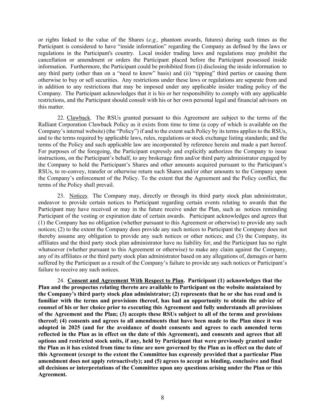 8 or rights linked to the value of the Shares (e.g., phantom awards, futures) during such times as the Participant is considered to have “inside information” regarding the Company as defined by the laws or regulations in the Participant's country. Local insider trading laws and regulations may prohibit the cancellation or amendment or orders the Participant placed before the Participant possessed inside information. Furthermore, the Participant could be prohibited from (i) disclosing the inside information to any third party (other than on a “need to know” basis) and (ii) “tipping” third parties or causing them otherwise to buy or sell securities. Any restrictions under these laws or regulations are separate from and in addition to any restrictions that may be imposed under any applicable insider trading policy of the Company. The Participant acknowledges that it is his or her responsibility to comply with any applicable restrictions, and the Participant should consult with his or her own personal legal and financial advisors on this matter. 22. Clawback. The RSUs granted pursuant to this Agreement are subject to the terms of the Ralliant Corporation Clawback Policy as it exists from time to time (a copy of which is available on the Company’s internal website) (the “Policy”) if and to the extent such Policy by its terms applies to the RSUs, and to the terms required by applicable laws, rules, regulations or stock exchange listing standards; and the terms of the Policy and such applicable law are incorporated by reference herein and made a part hereof. For purposes of the foregoing, the Participant expressly and explicitly authorizes the Company to issue instructions, on the Participant’s behalf, to any brokerage firm and/or third party administrator engaged by the Company to hold the Participant’s Shares and other amounts acquired pursuant to the Participant’s RSUs, to re-convey, transfer or otherwise return such Shares and/or other amounts to the Company upon the Company’s enforcement of the Policy. To the extent that the Agreement and the Policy conflict, the terms of the Policy shall prevail. 23. Notices. The Company may, directly or through its third party stock plan administrator, endeavor to provide certain notices to Participant regarding certain events relating to awards that the Participant may have received or may in the future receive under the Plan, such as notices reminding Participant of the vesting or expiration date of certain awards. Participant acknowledges and agrees that (1) the Company has no obligation (whether pursuant to this Agreement or otherwise) to provide any such notices; (2) to the extent the Company does provide any such notices to Participant the Company does not thereby assume any obligation to provide any such notices or other notices; and (3) the Company, its affiliates and the third party stock plan administrator have no liability for, and the Participant has no right whatsoever (whether pursuant to this Agreement or otherwise) to make any claim against the Company, any of its affiliates or the third party stock plan administrator based on any allegations of, damages or harm suffered by the Participant as a result of the Company’s failure to provide any such notices or Participant’s failure to receive any such notices. 24. Consent and Agreement With Respect to Plan. Participant (1) acknowledges that the Plan and the prospectus relating thereto are available to Participant on the website maintained by the Company’s third party stock plan administrator; (2) represents that he or she has read and is familiar with the terms and provisions thereof, has had an opportunity to obtain the advice of counsel of his or her choice prior to executing this Agreement and fully understands all provisions of the Agreement and the Plan; (3) accepts these RSUs subject to all of the terms and provisions thereof; (4) consents and agrees to all amendments that have been made to the Plan since it was adopted in 2025 (and for the avoidance of doubt consents and agrees to each amended term reflected in the Plan as in effect on the date of this Agreement), and consents and agrees that all options and restricted stock units, if any, held by Participant that were previously granted under the Plan as it has existed from time to time are now governed by the Plan as in effect on the date of this Agreement (except to the extent the Committee has expressly provided that a particular Plan amendment does not apply retroactively); and (5) agrees to accept as binding, conclusive and final all decisions or interpretations of the Committee upon any questions arising under the Plan or this Agreement.