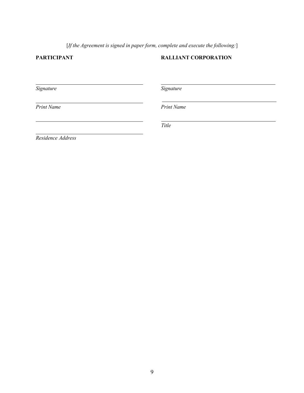 9 [If the Agreement is signed in paper form, complete and execute the following:] PARTICIPANT RALLIANT CORPORATION Signature Signature Print Name Print Name Title Residence Address